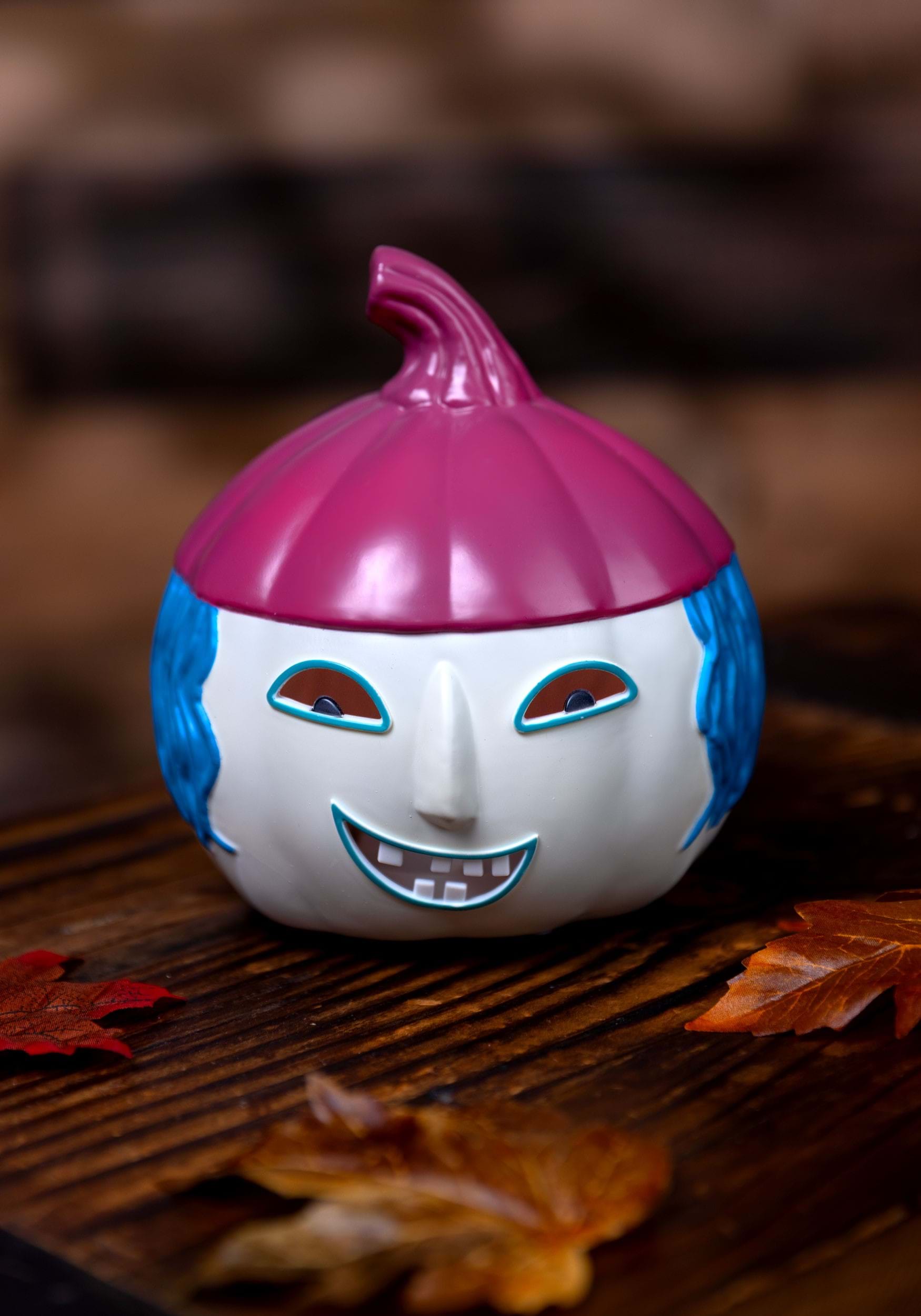 This officially licensed Nightmare Before Christmas 6-Inch Shock Light Up Pumpkin Decoration is perfect for fans of the classic holiday movie! The molded plastic pumpkin is decorated to look like Shock's grinning head, complete with purple hat and blue hair. When activated, an inner LED light illuminates the decoration's cut-out eyes and mouth.