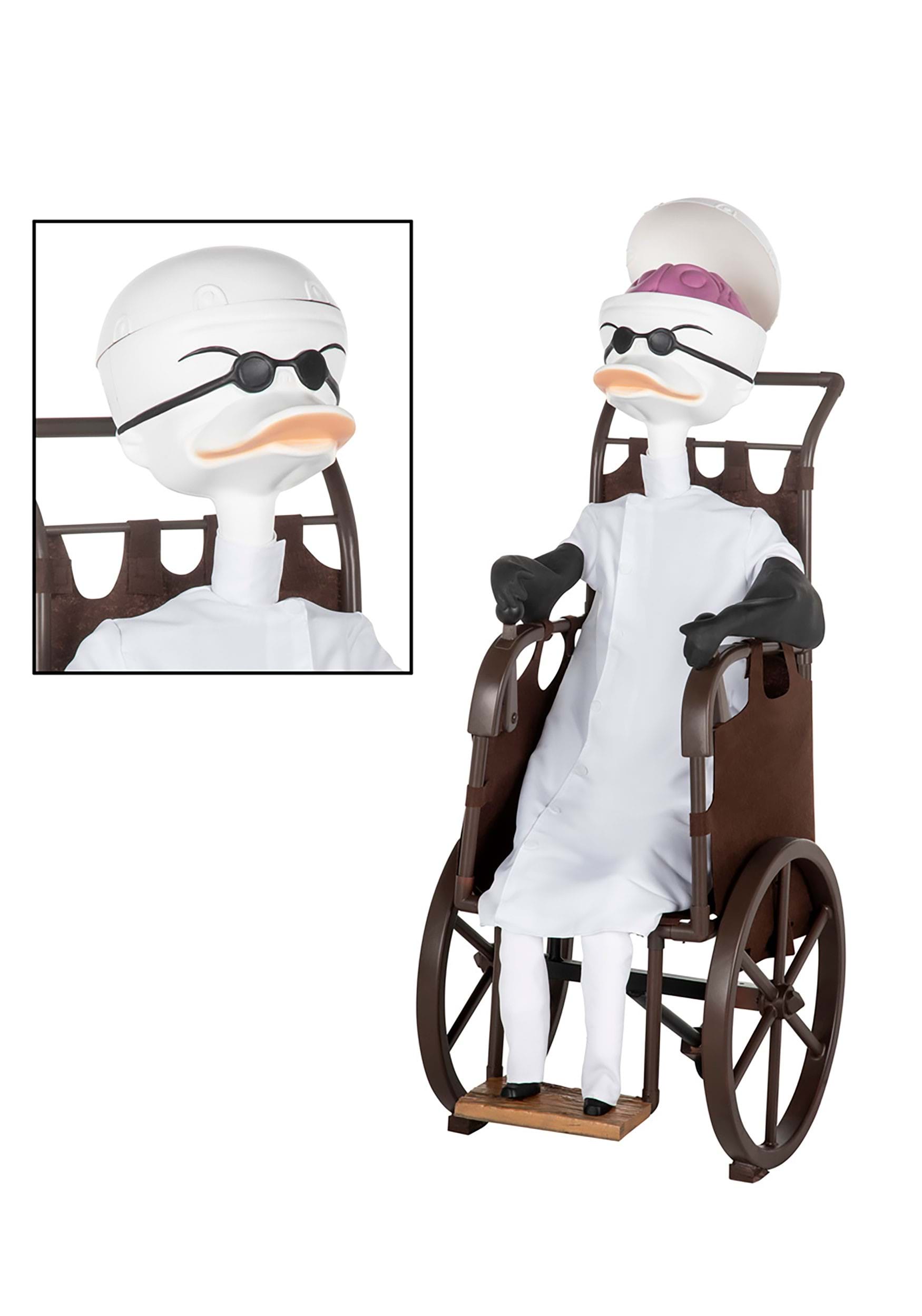 Crafted with incredible detail, this animatronic prop features Dr. Finkelstein in his brown wooden wheelchair, complete with a high backrest and large rear wheels. The realistic design ensures it stands out as a centerpiece in any Halloween display. But it's not just about the looks – this decoration comes to life with animatronic motion, moving its arm and flipping open its head to reveal a bright pink brain.