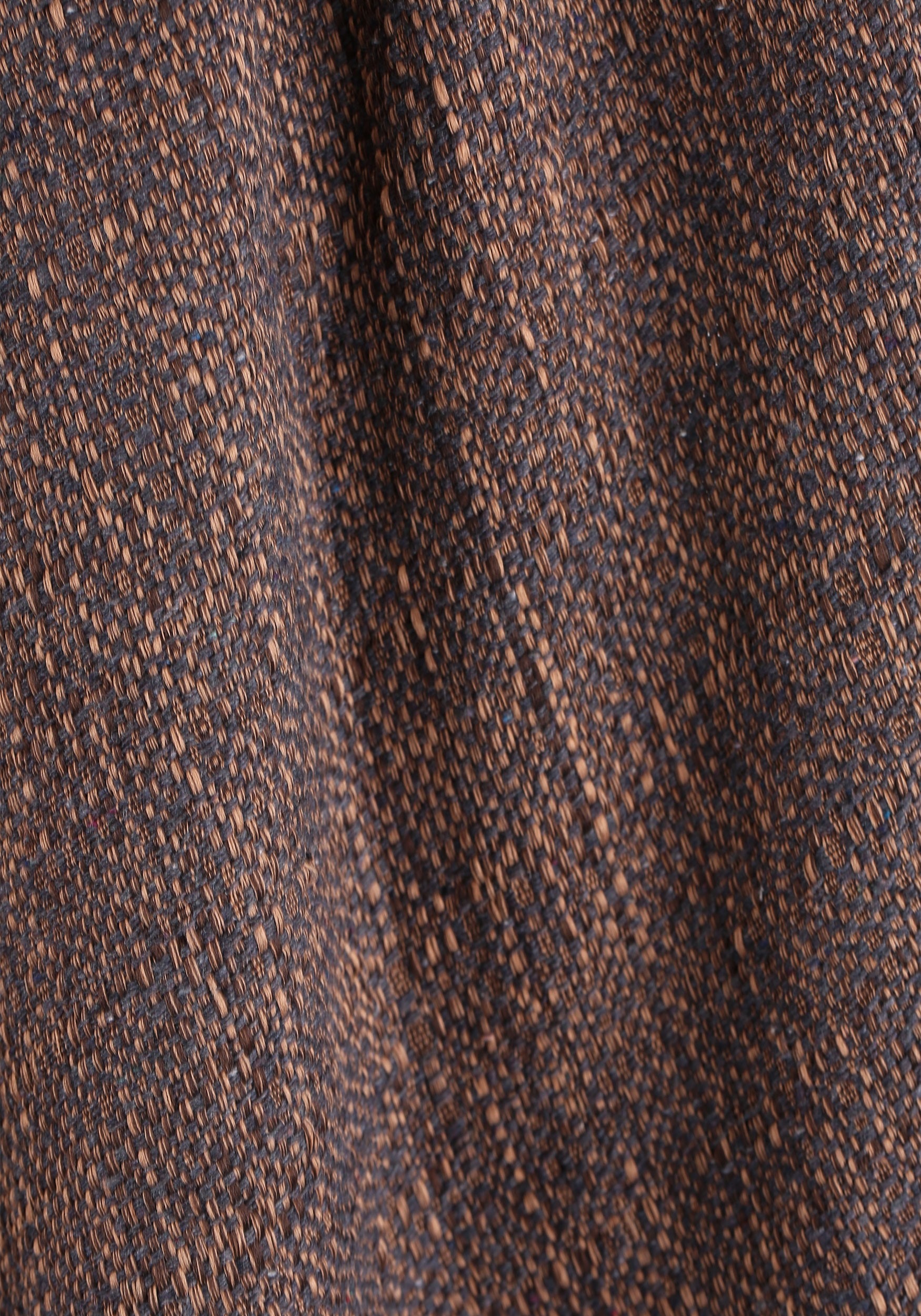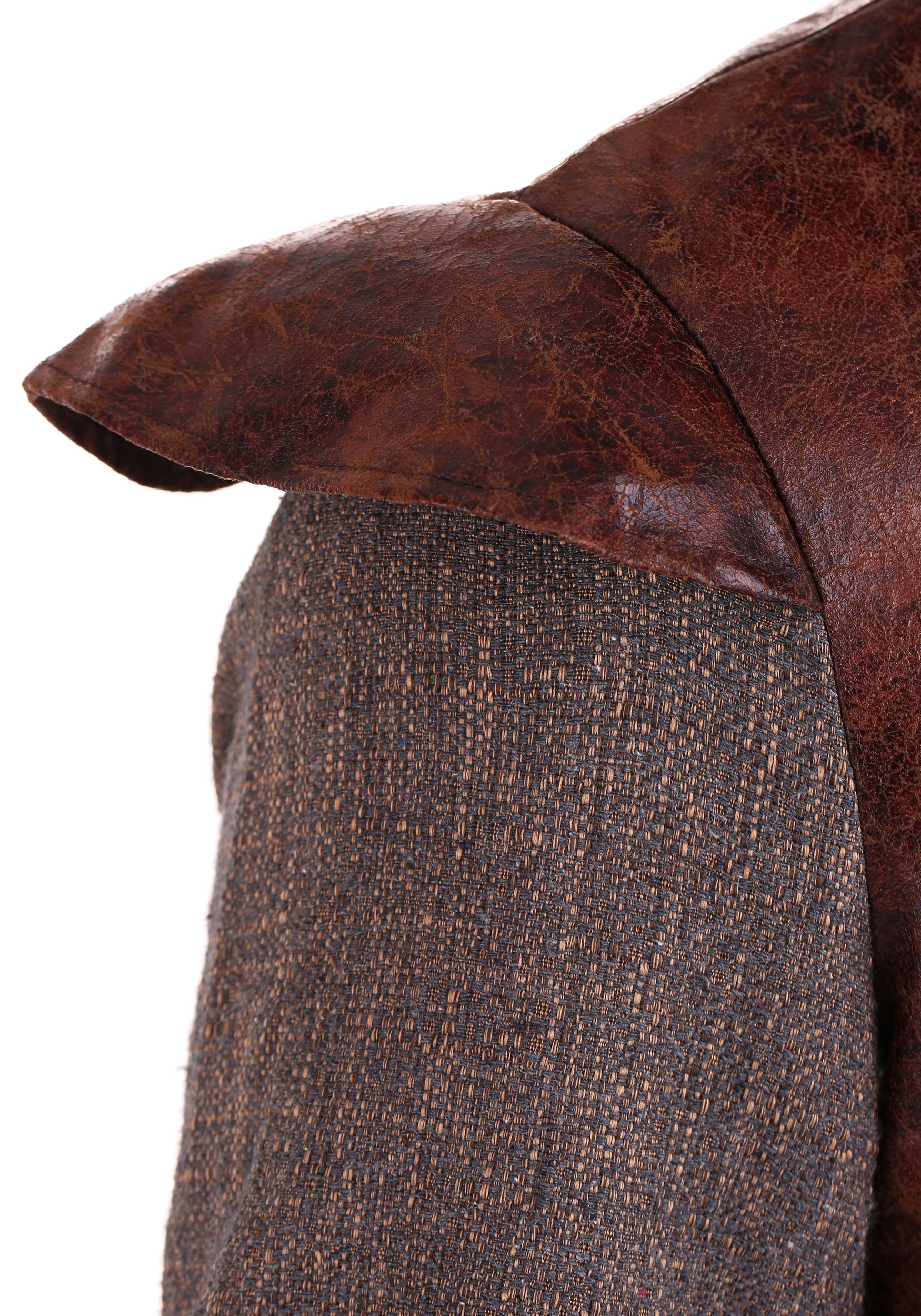 - Tunic body is faux suede and faux leather with back zipper, faux linen collar and sleeves