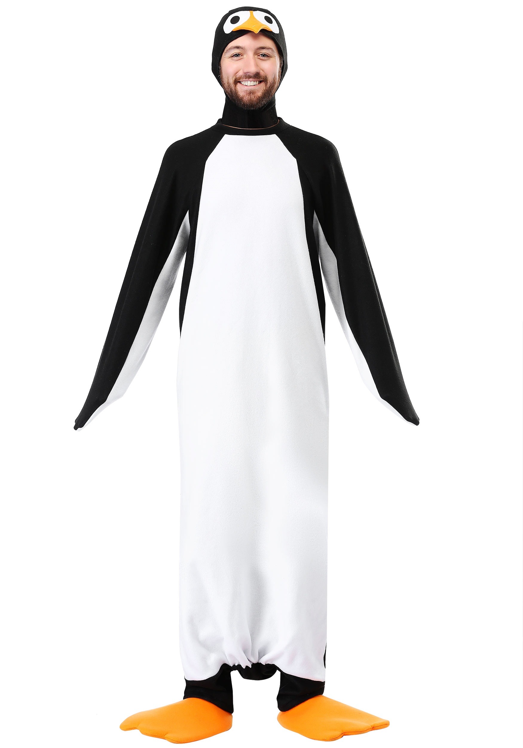 Now look as the male stuffs one leg, then both legs into the Adult Happy Penguin Costume. See the magnificent way in which he pulls the zipper up the back of the body suit. Oh, he seems to be have snagged the zipper on a piece of fabric from his shirt. His human mate sees him unable to pull the zipper any farther, his elbows high in the air, trying in vain to get the zipper to come back down. This is why male penguins keep the egg warm, while their female counterparts hunt for the food. She instructs him to put his arms in the wings. Then graciously zips him up. This is a joyful moment of human triumph, before the dreaded holiday season begins.