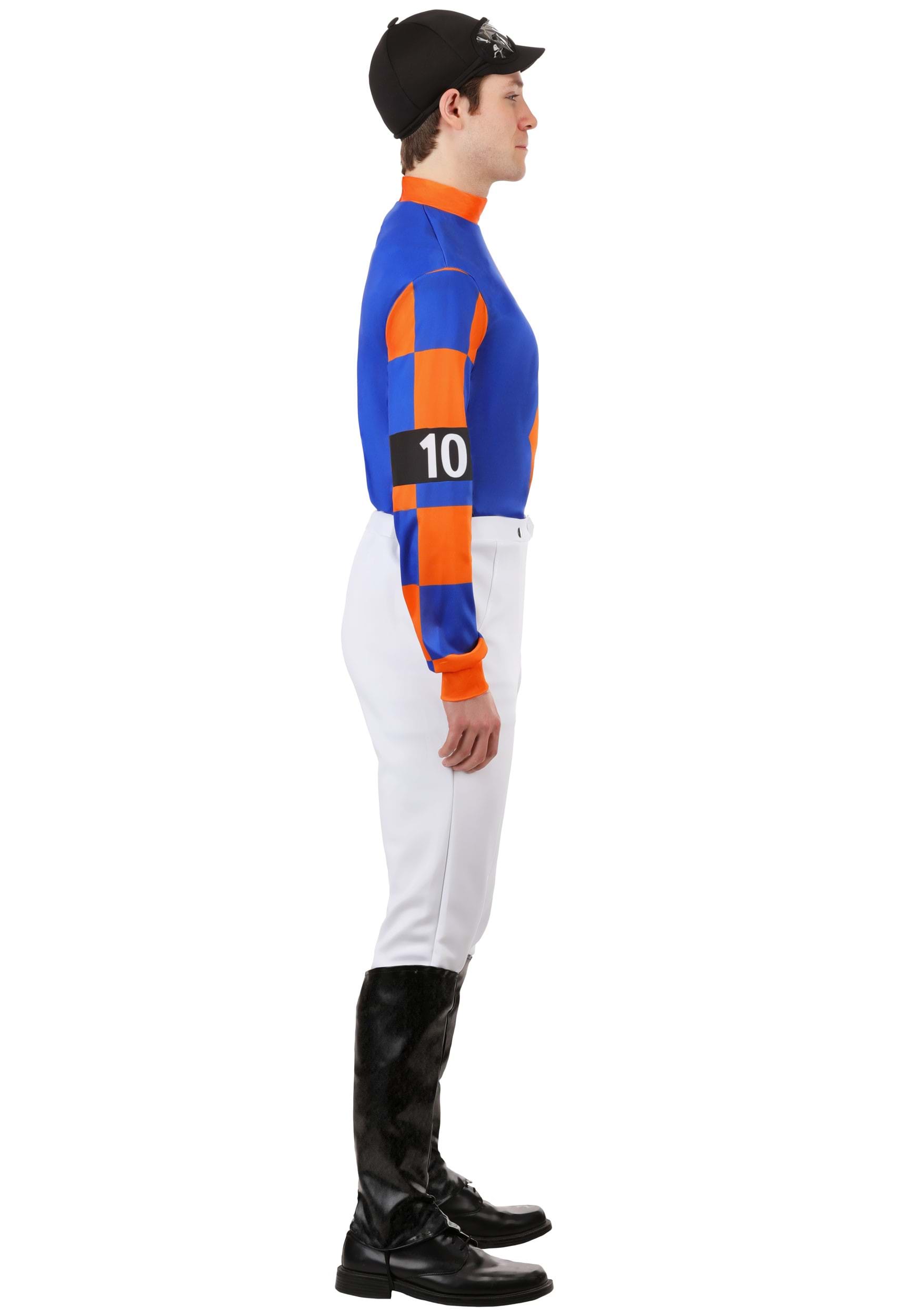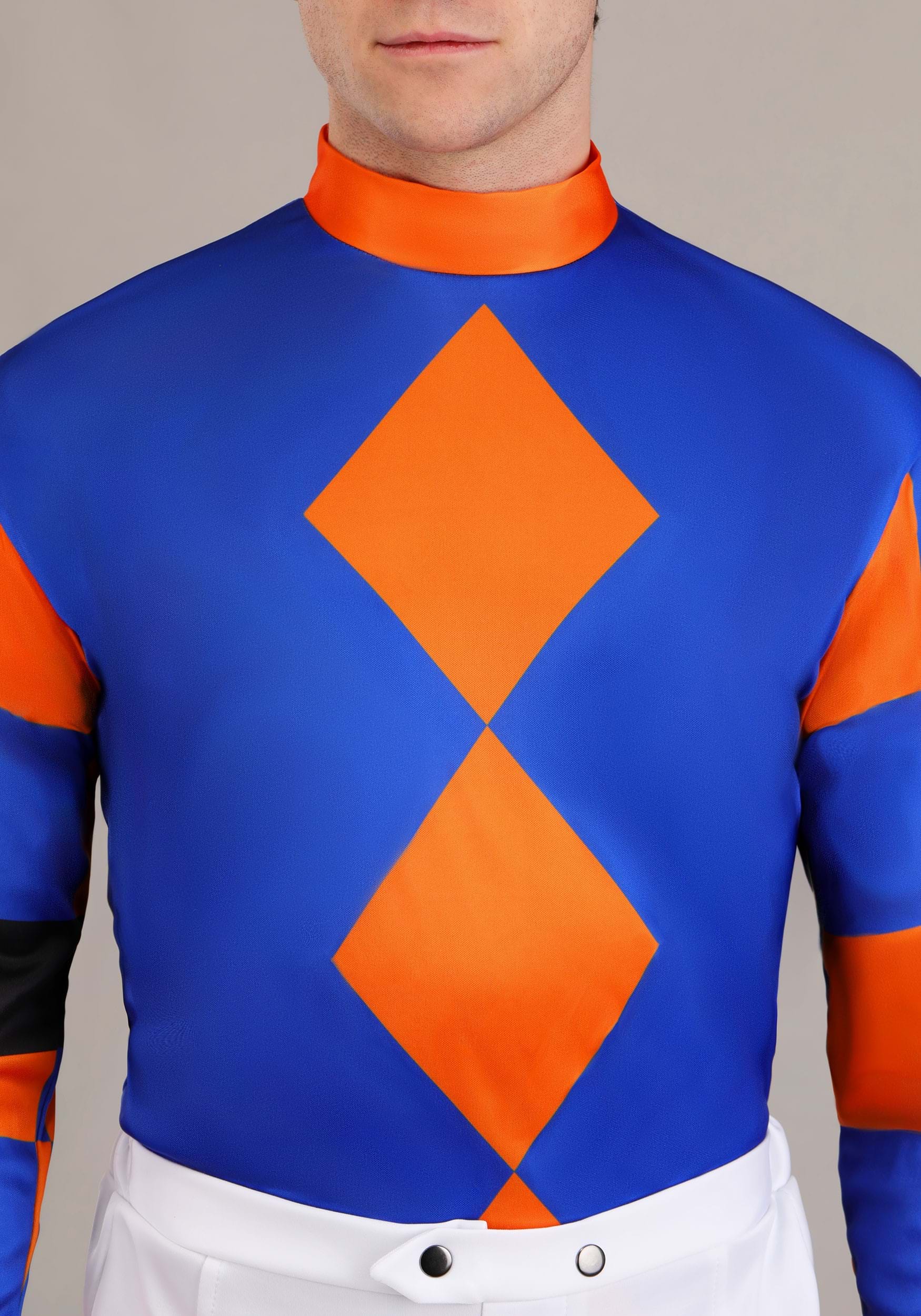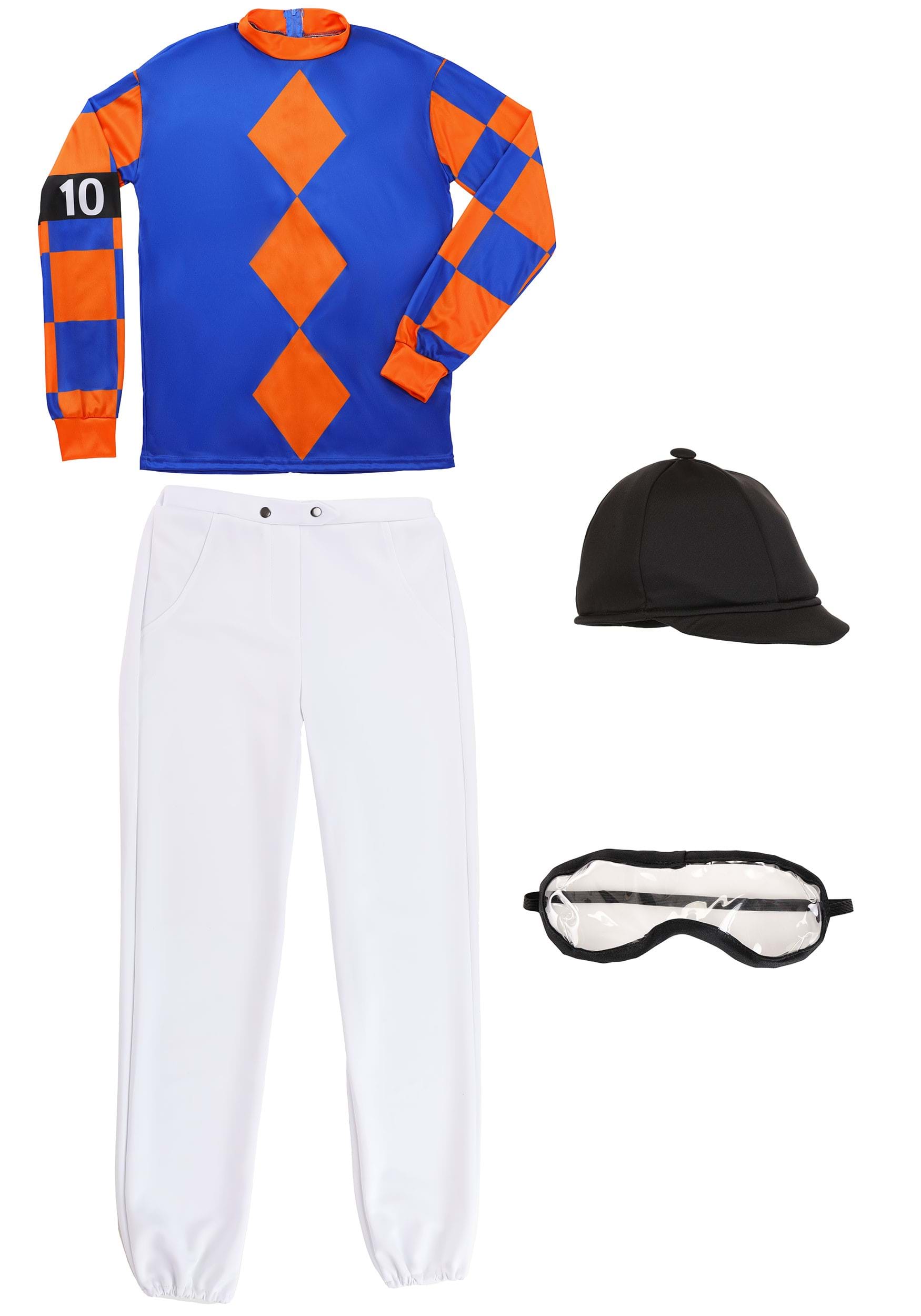 You'll feel ready to ride as soon as you slip this jockey costume on! Made By Us, it was designed by our in-house creative team for some serious Kentucky Derby fun. It features a fitted bright blue and orange jersey that zips up the back and has a band with the number 10 printed on the sleeve. Boots covers that can loop over a pair of black dress shoes layer over the fitted bright white pants. a helmet with a small brim, and goggles complete the look.