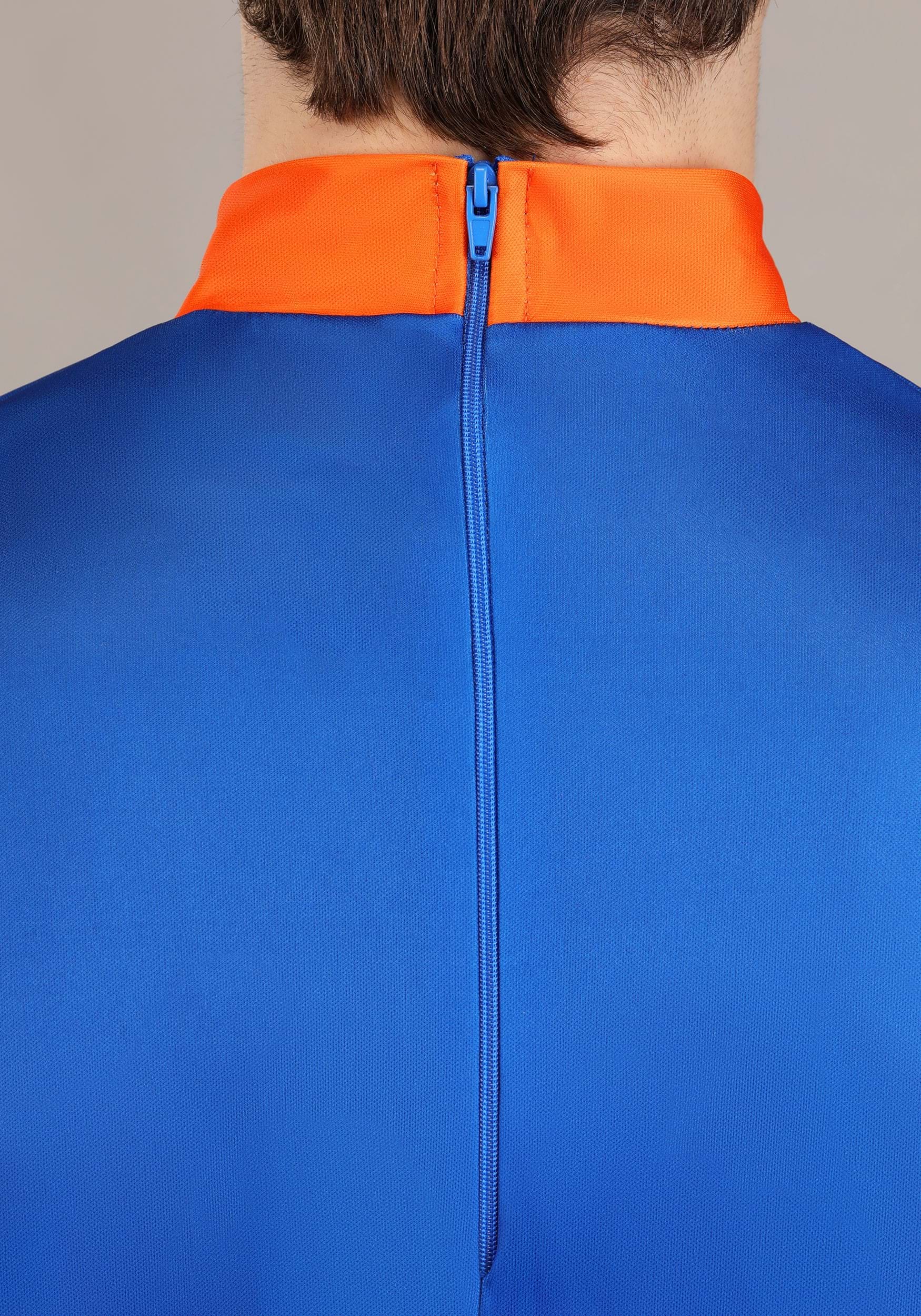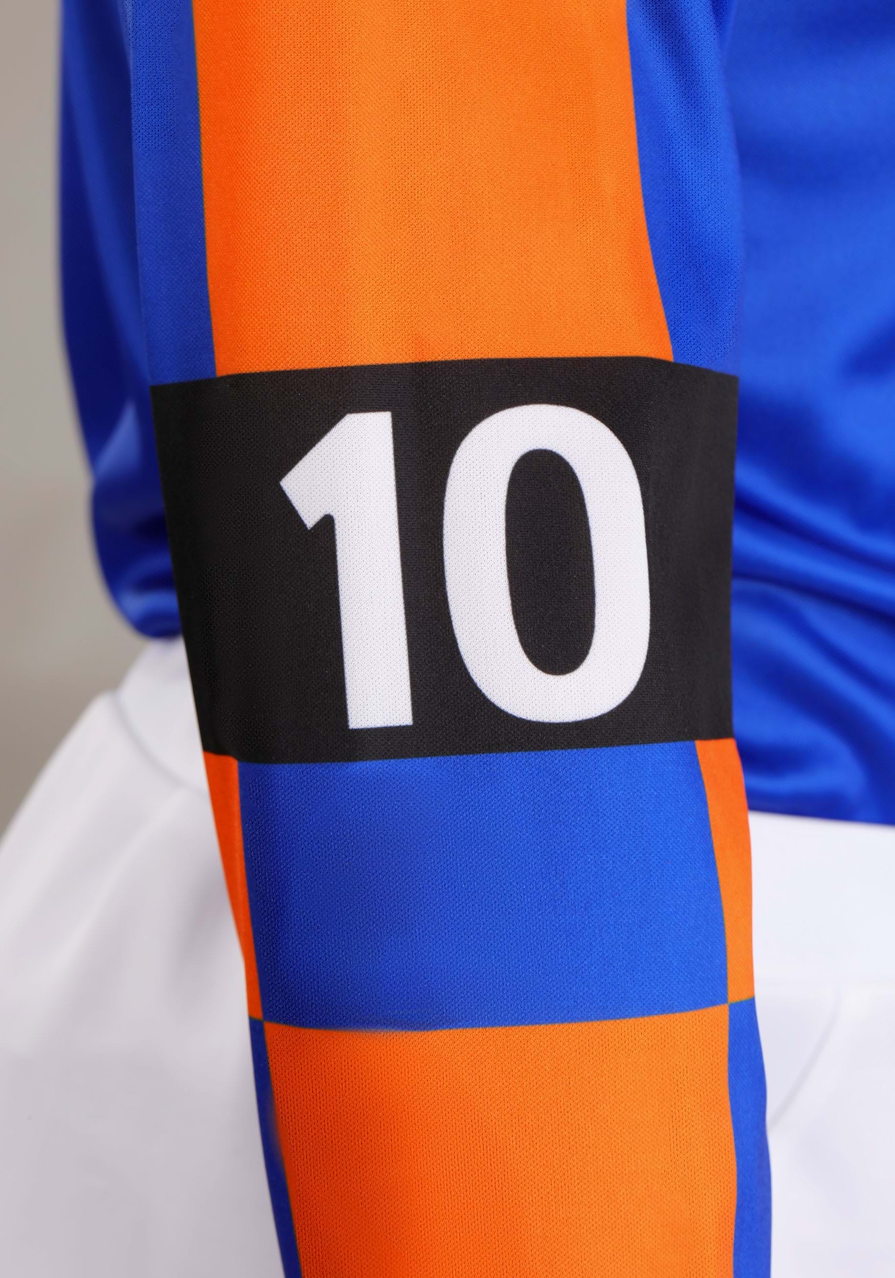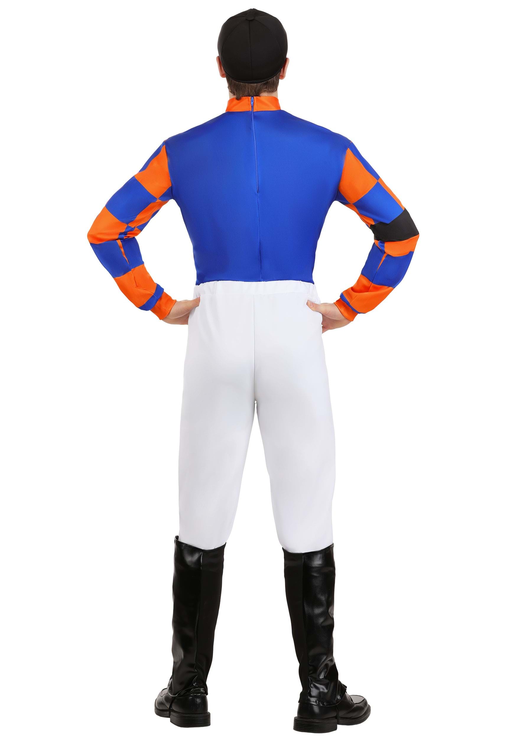 You'll feel ready to ride as soon as you slip this jockey costume on! Made By Us, it was designed by our in-house creative team for some serious Kentucky Derby fun. It features a fitted bright blue and orange jersey that zips up the back and has a band with the number 10 printed on the sleeve. Boots covers that can loop over a pair of black dress shoes layer over the fitted bright white pants. a helmet with a small brim, and goggles complete the look.