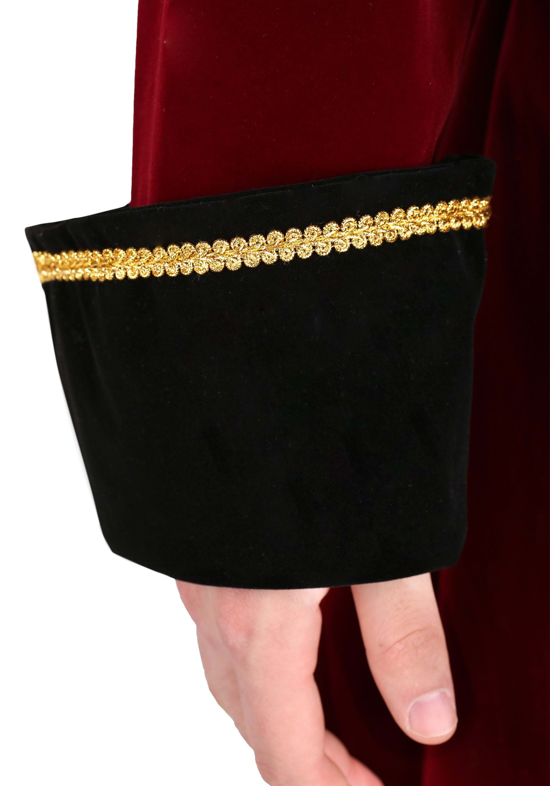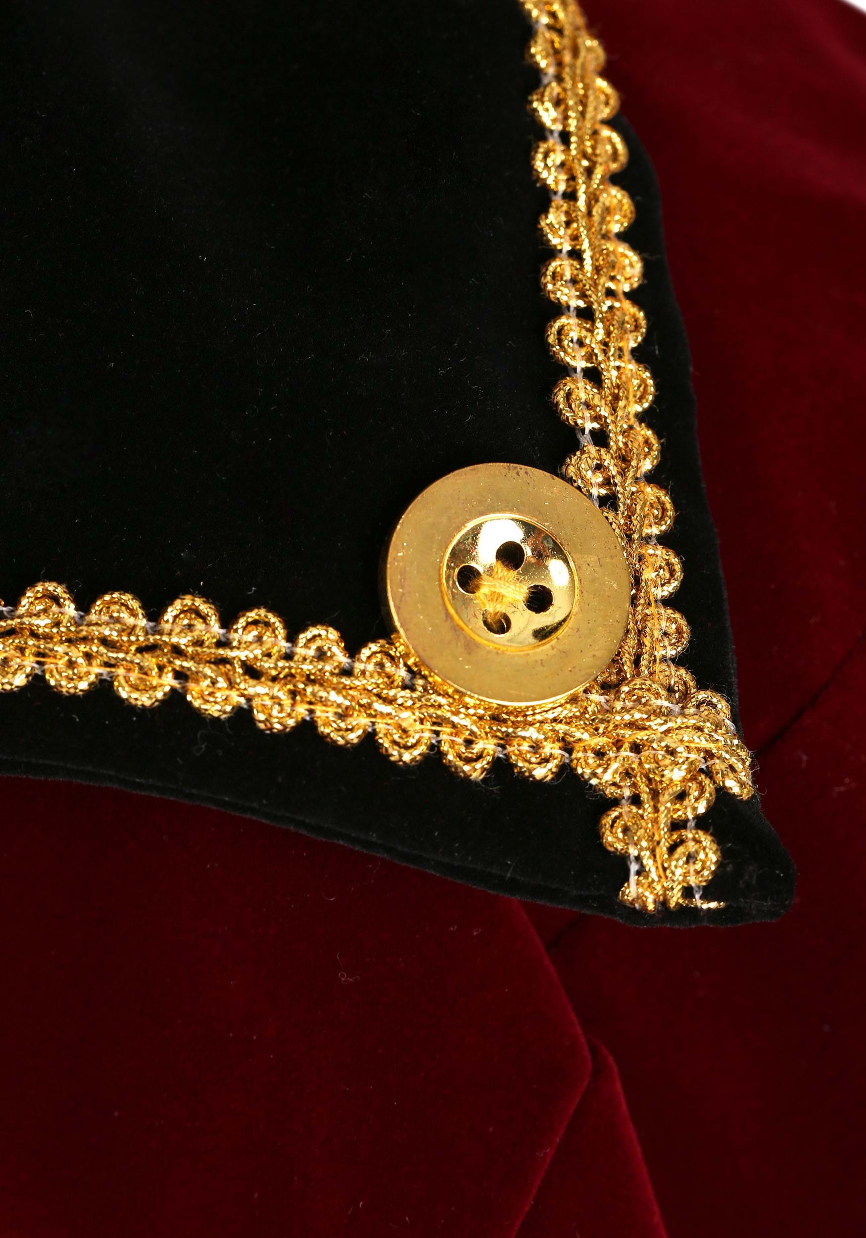 • Maroon velvet jacket has black velvet collar, lapels, sleeve cuffs, and false pocket flaps