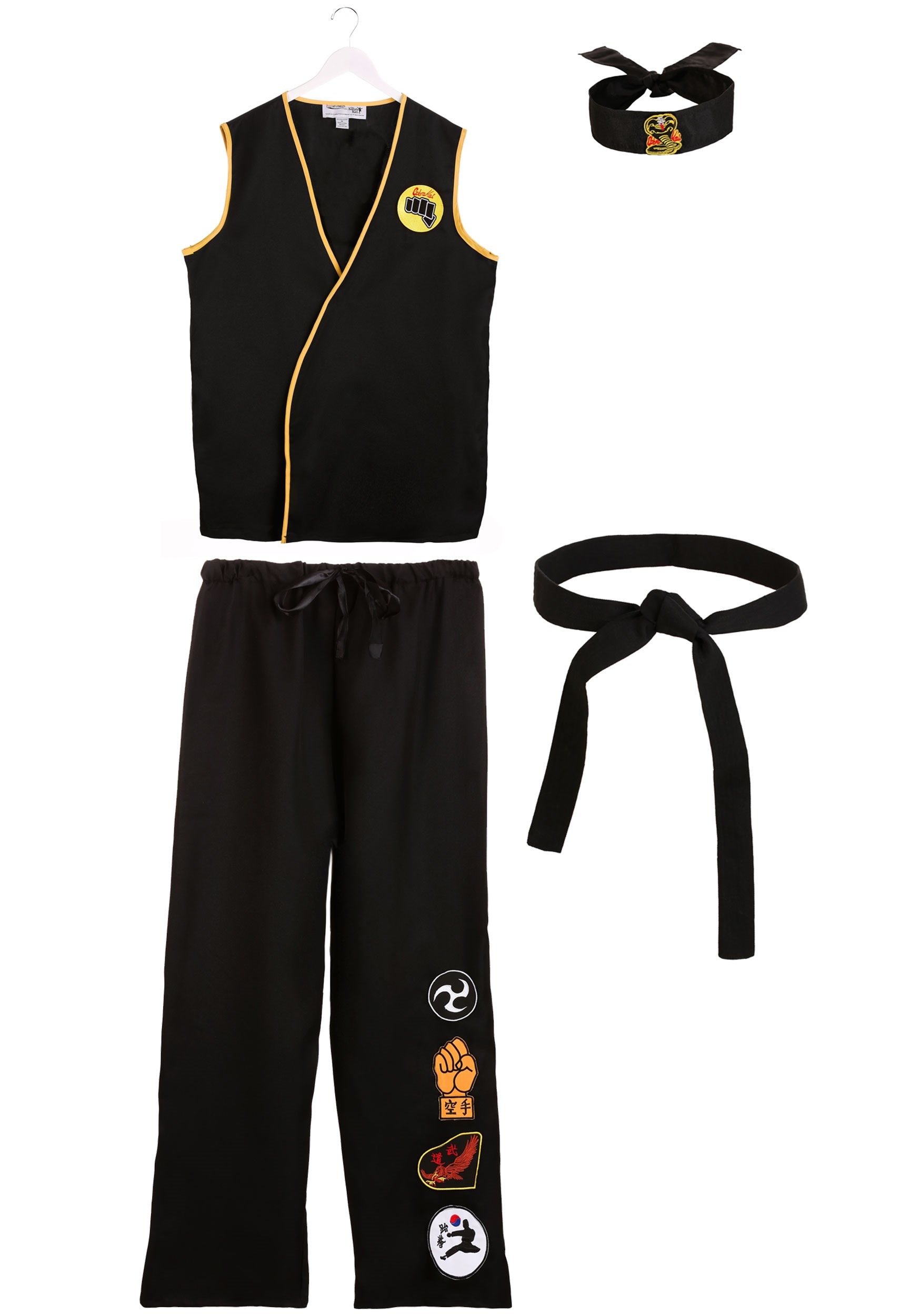 This one is officially licensed and exclusive, you won't find it anywhere else. It's 100% polyester poplin fabric. The tunic shirt has a self-fabric waist tie, gold edging, and an embroidered Cobra Kai logo. The pants have an elastic waist and embroidered patches featured on each leg. The twill belt is 2 inches wide, and the headband is 2 inches wide with an embroidered patch in the center.