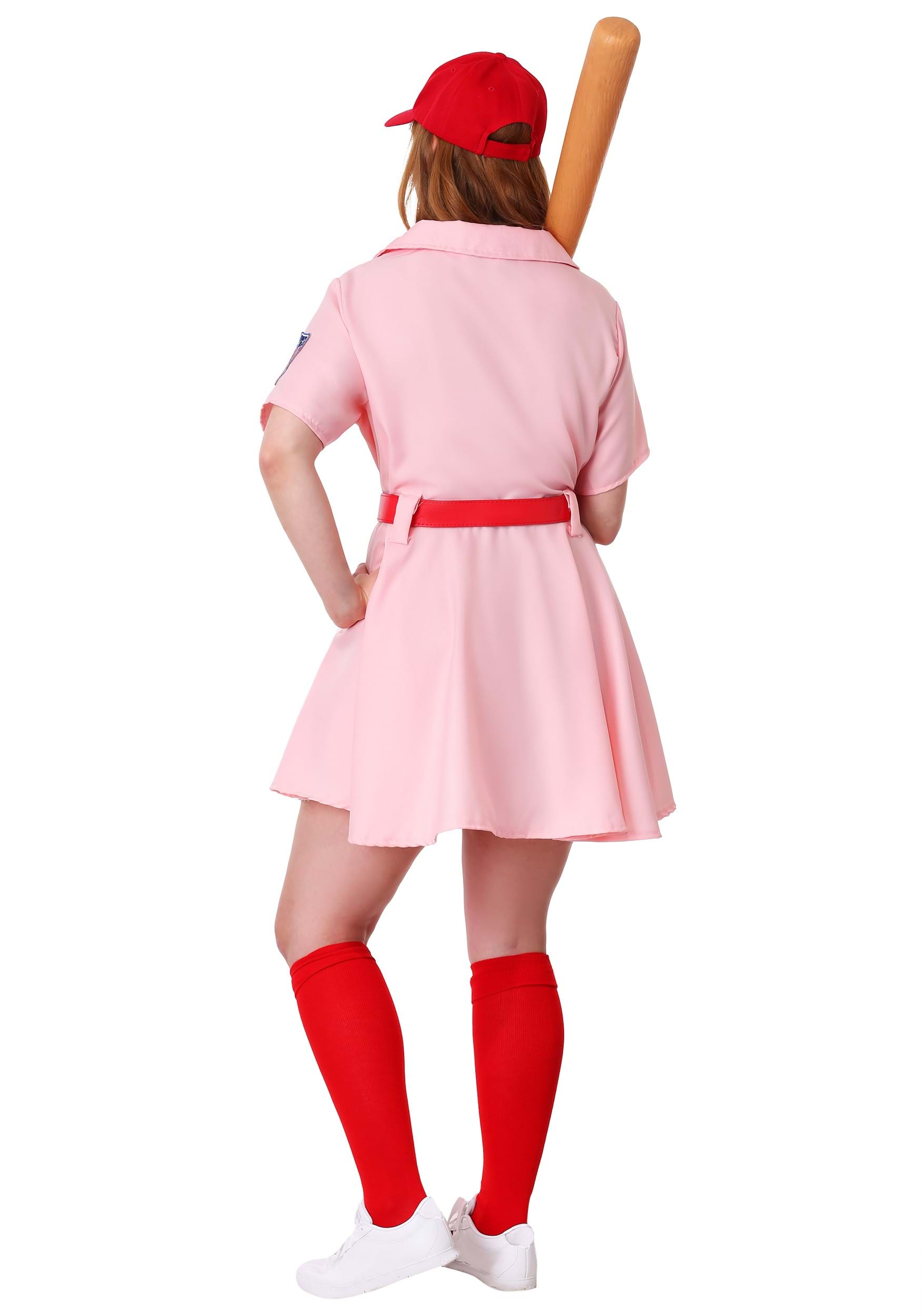 This officially licensed Plus Size League of Their Own Dottie Costume is exclusive and made by us at Halloween Costumes to look just like the uniform worn in the movie. The short-sleeved twill dress is pink with embroidered stars-and-bars shield and A League of Their Own patches. Accessories include a red faux leather belt with buckle, knit knee-high socks, and a ball cap with embroidered “R” (Rockford Peaches) patch. You’ll need to supply your own bat, shoes, and winning spirit, but we figure that won’t be a problem! This League of Their Own Dottie Costume is Plus Sized so anyone can be the hero in their own story, which is really the most important part of playing.