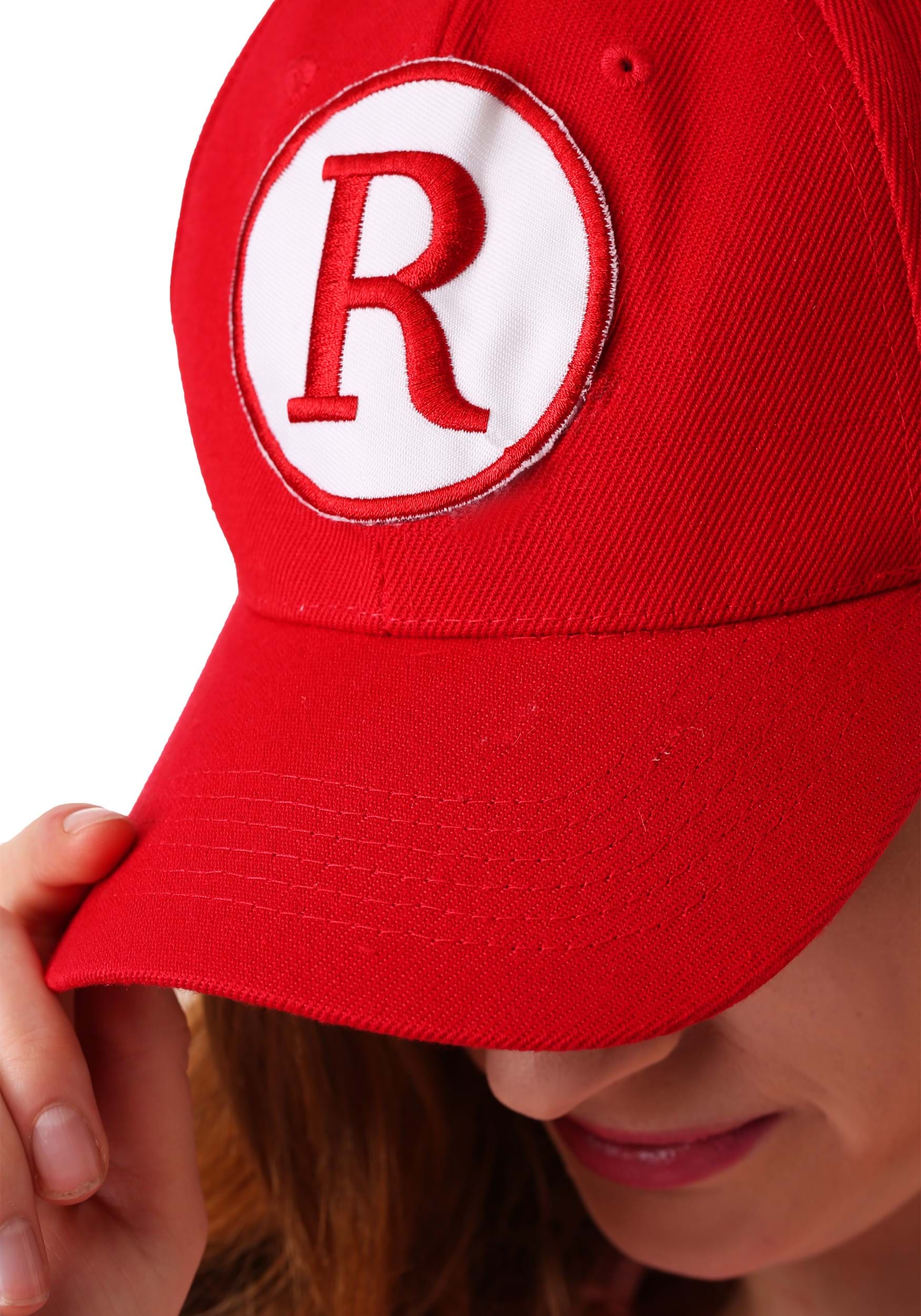 - Red canvas ball cap has embroidered "R" patch on front, adjustable at back