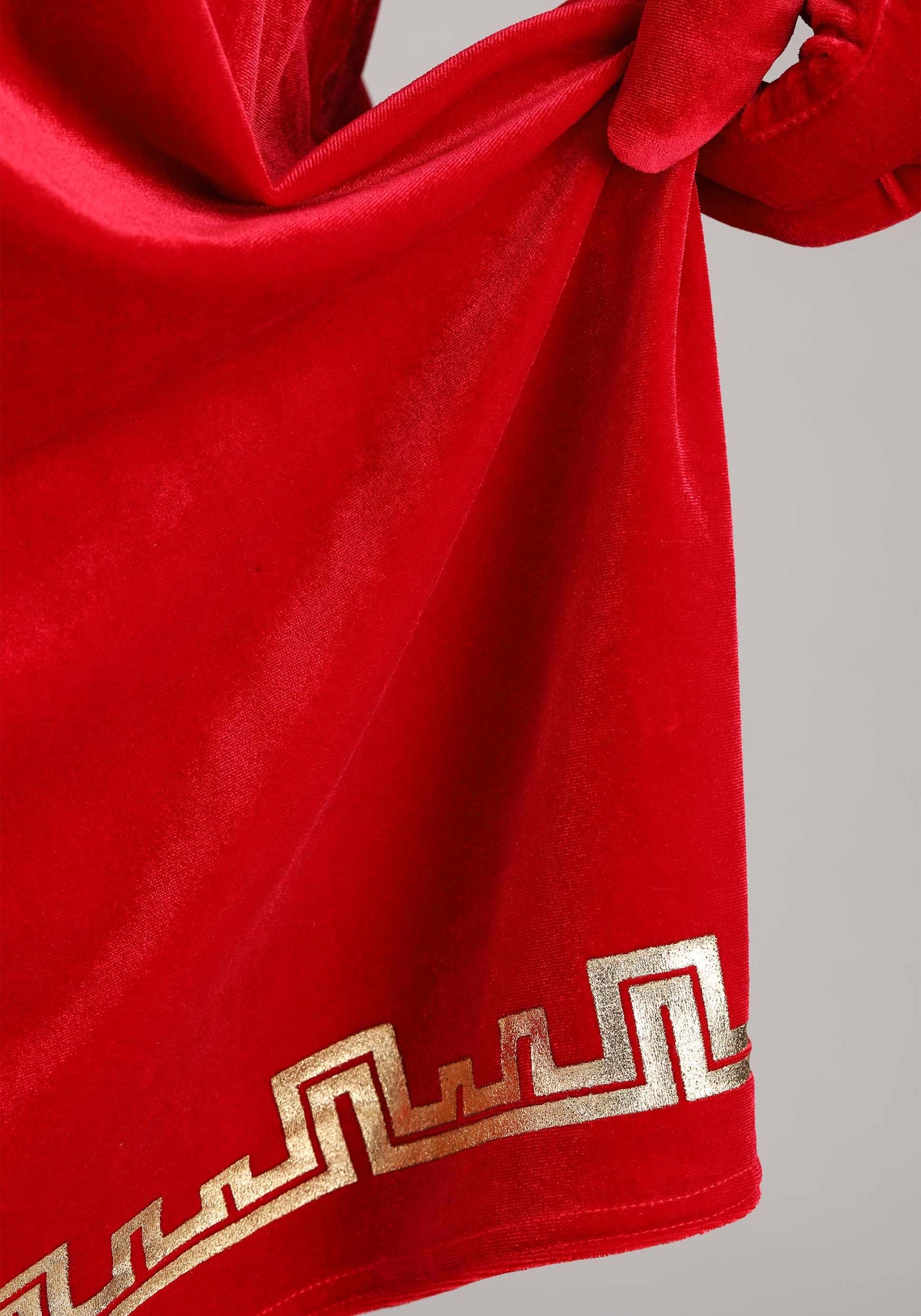 - Pullover velour tunic has puffy sleeves with satin fabric, satin trim and black jersey knit ends