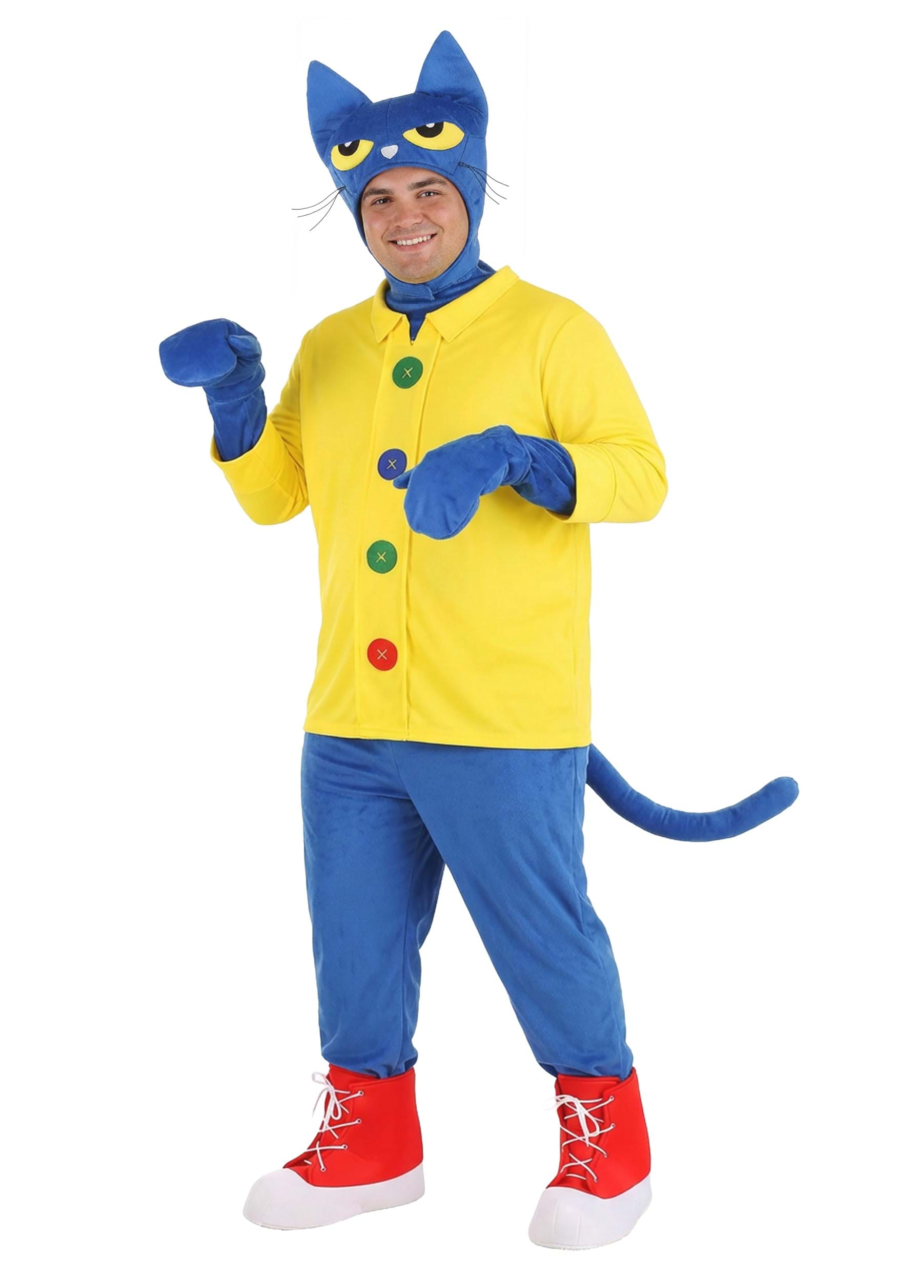 This Plus Size Pete the Cat Costume is one of our exclusive, Made by Us costumes! The officially licensed outfit was designed by our expert costume designers to give you the ultimate Pete the Cat experience. The costume comes with a yellow top which is designed to look like his coat from Pete the Cat and His Four Groovy Buttons. It even has his four mismatched buttons appliqaued on the front of it. The pants look like Pete's blue fur and they even have an attached tail in back. The mitts are a matching blue color and fit on your hands. The boot covers fit over most pairs of shoes and they even look like Pete's shoes from Pete the Cat: I Love My White Shoes. Finally, this costume comes with a hood that has a pair of cat ears and Pete's yellow eyes on top. Put it all together and you'll look like one cool kitty cat!
