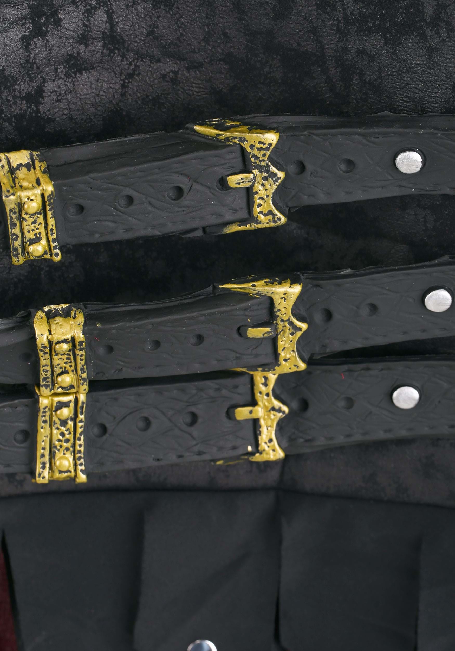 - Chest piece has gold piping, molded vinyl belts attached to front, faux suede lappets hanging from waist, cape sewn to shoulders