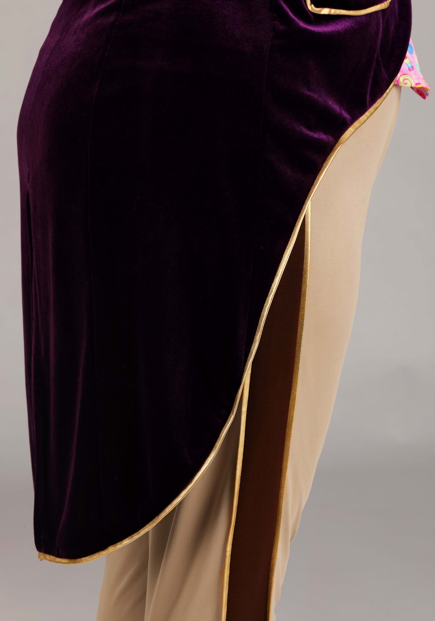 - Velvet cutaway tailcoat jacket has satin vest panels sewn into side and shoulder seams