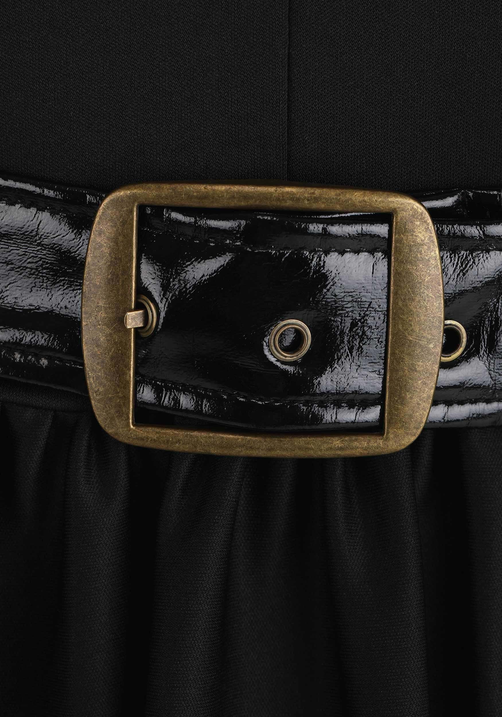 - Shiny vinyl belt has a metal buckle w/ size adjustment holes