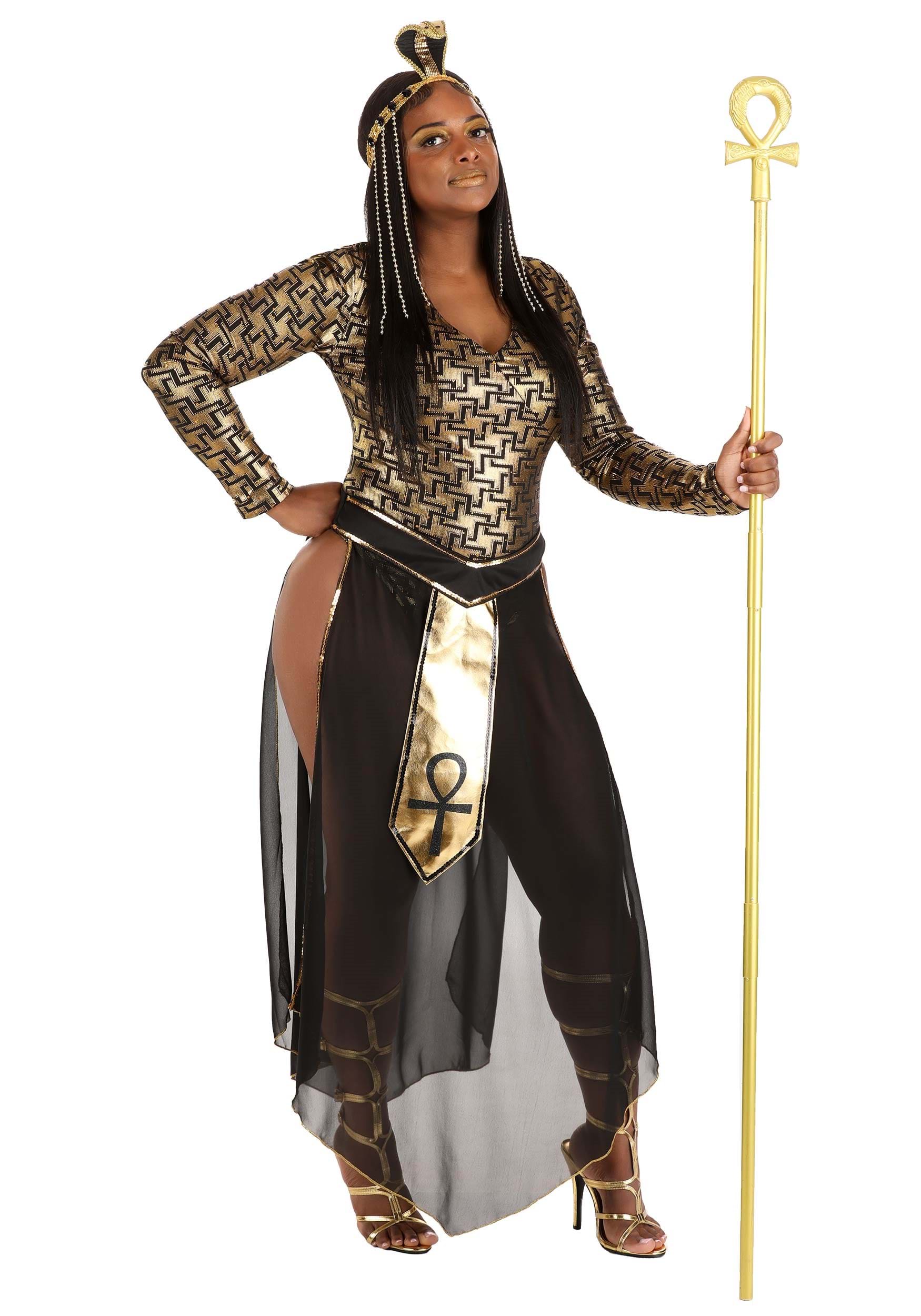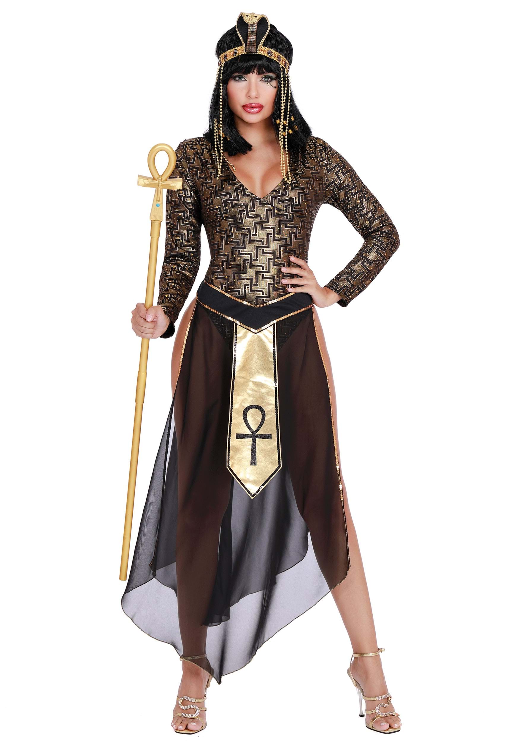 It takes a lot of confidence to rule like legendary Cleopatra and no ensemble says confidence quite like this look. In classy black and gold, this costume features a geometric bodysuit with a sheer panel at the front and back, framing the hips. You'll love the combination of long sleeves and dramatic V-neck. A zipper up the back and snap at the crotch makes bathroom breaks and costume changes a breeze. Topped off with a beaded cobra headpiece, you'll look every inch the queen as soon as you slip into this Cleopatra costume.