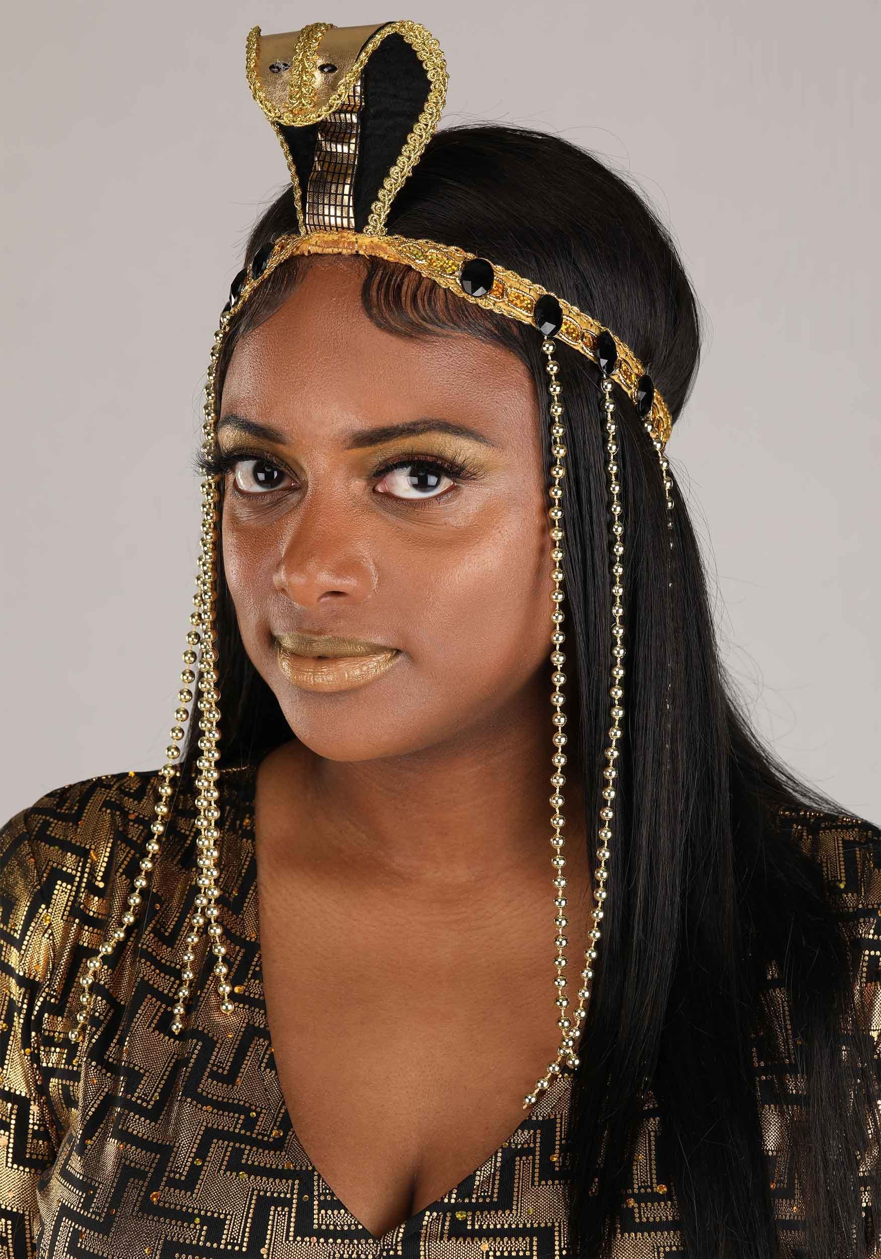 - Headband has 3 hanging strands of beads at each side, multiple faux gems, upright cobra at front