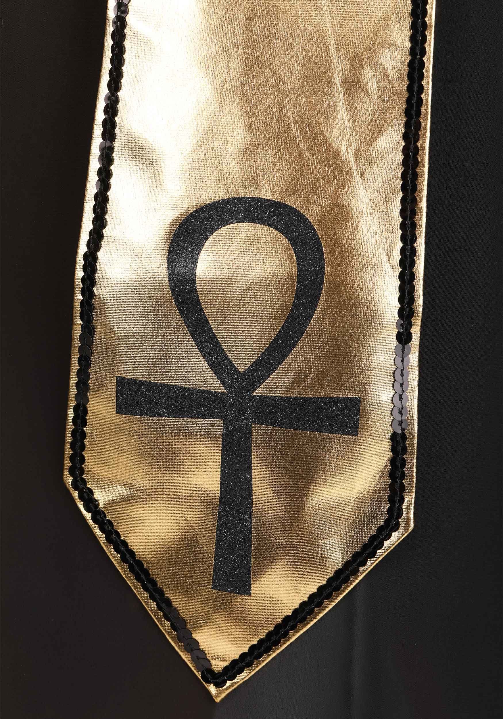 - Skirt has front and back chiffon panels joined at waist by yoke; front has gold faux leather drape with glittery printed ankh