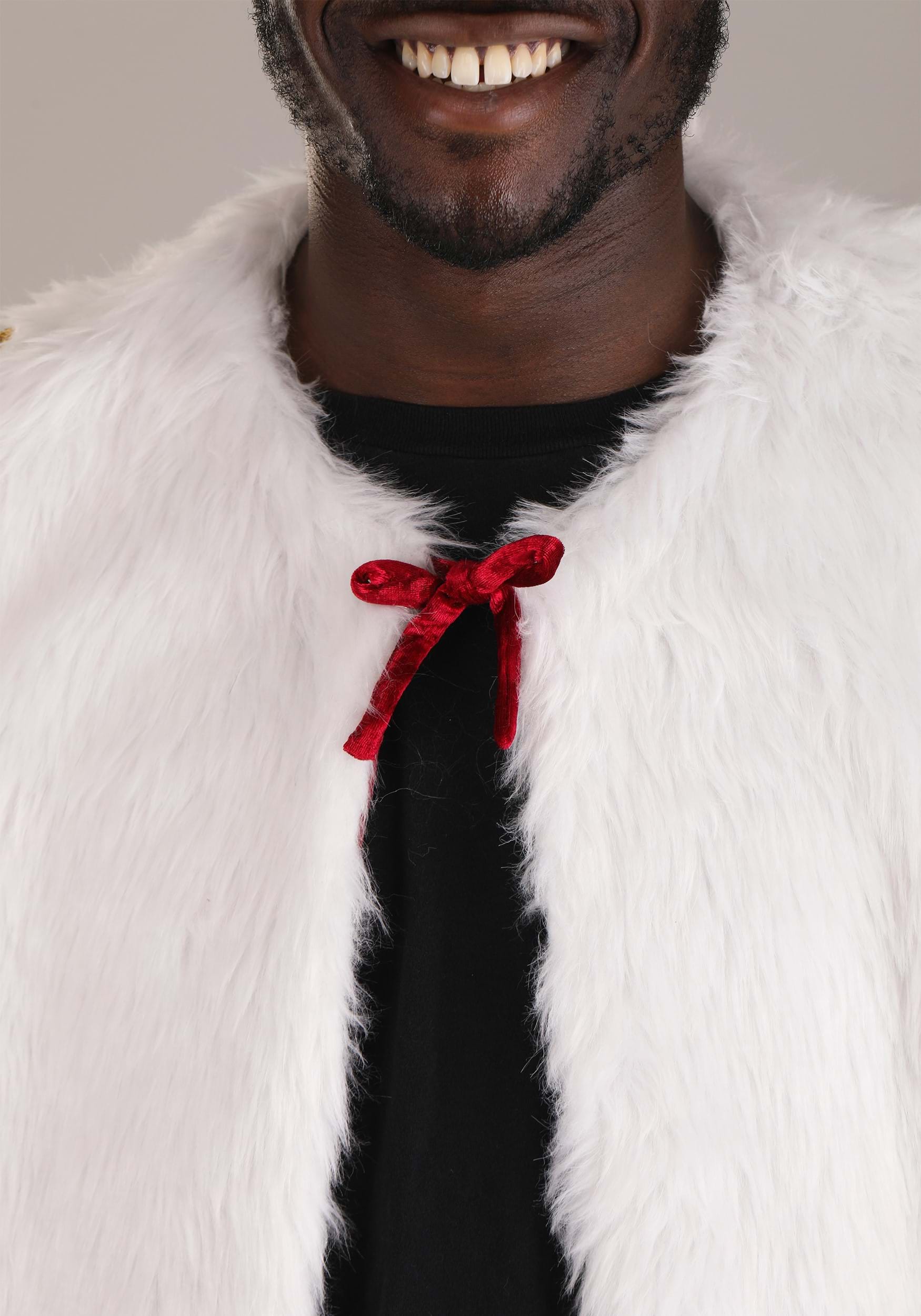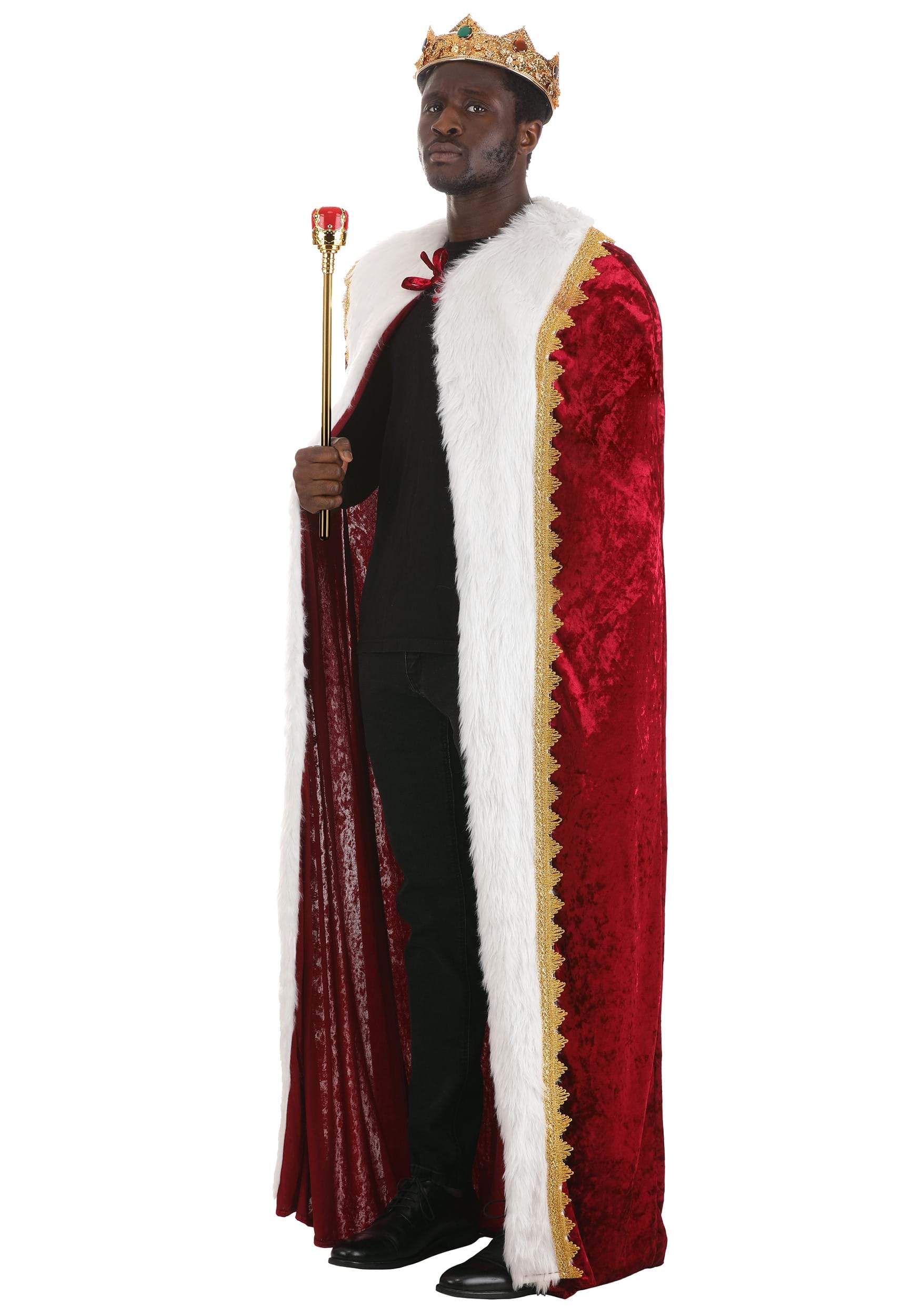 This regal robe accessory is designed with a king in mind. It is made of a soft crushed velvet fabric that will extend from your neck down to your feet. The robe's neckline and front edges have a band of soft white faux fur that is edged with gold braid trim. Make it known at the party who rules the kingdom, and do so gracefully. As gracefully as this exclusive Made By Us product will hang from your kingly shoulders.