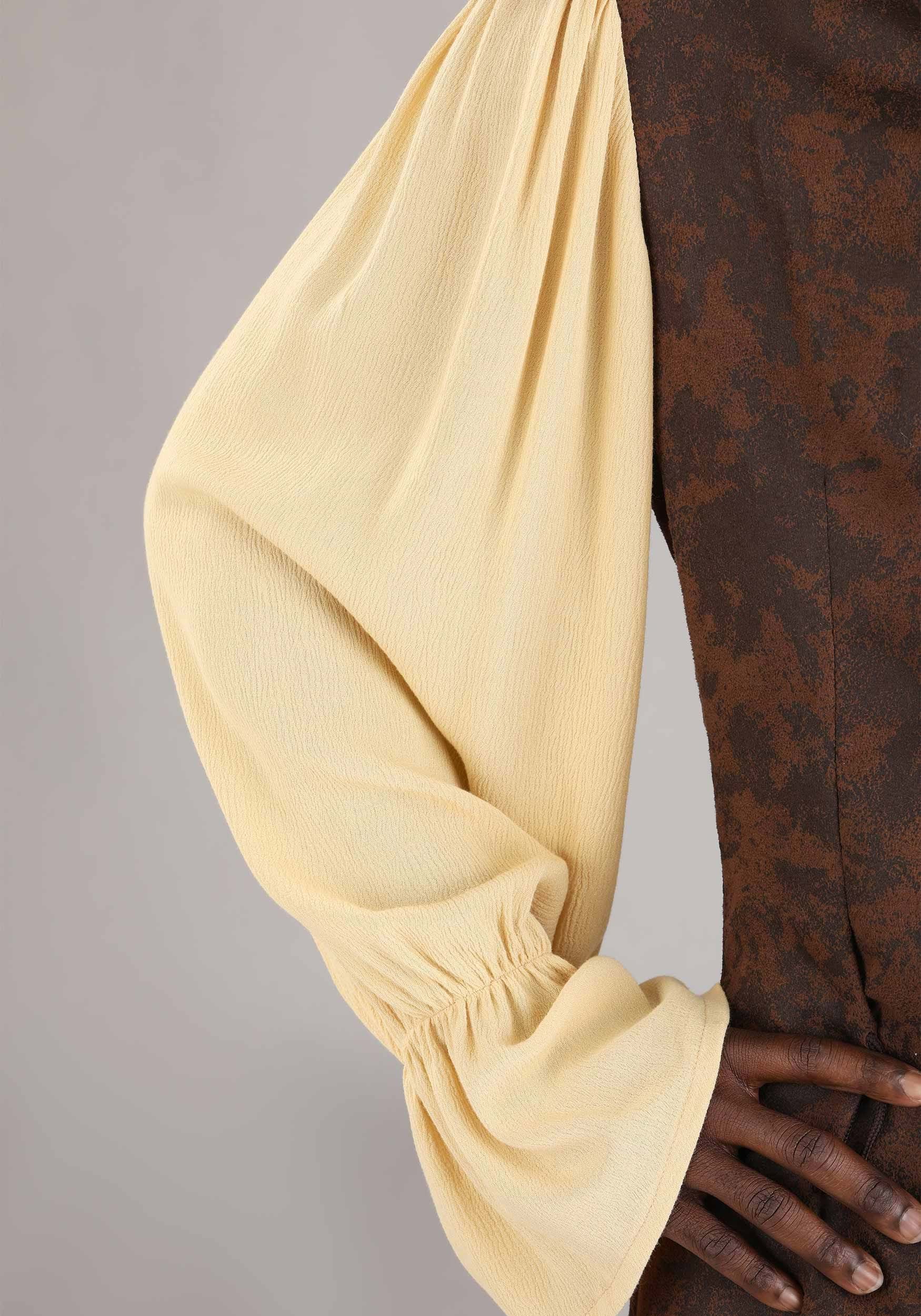 - Shirt has faux suede vest body, gauze collar and sleeves, elastic bands in the wrists