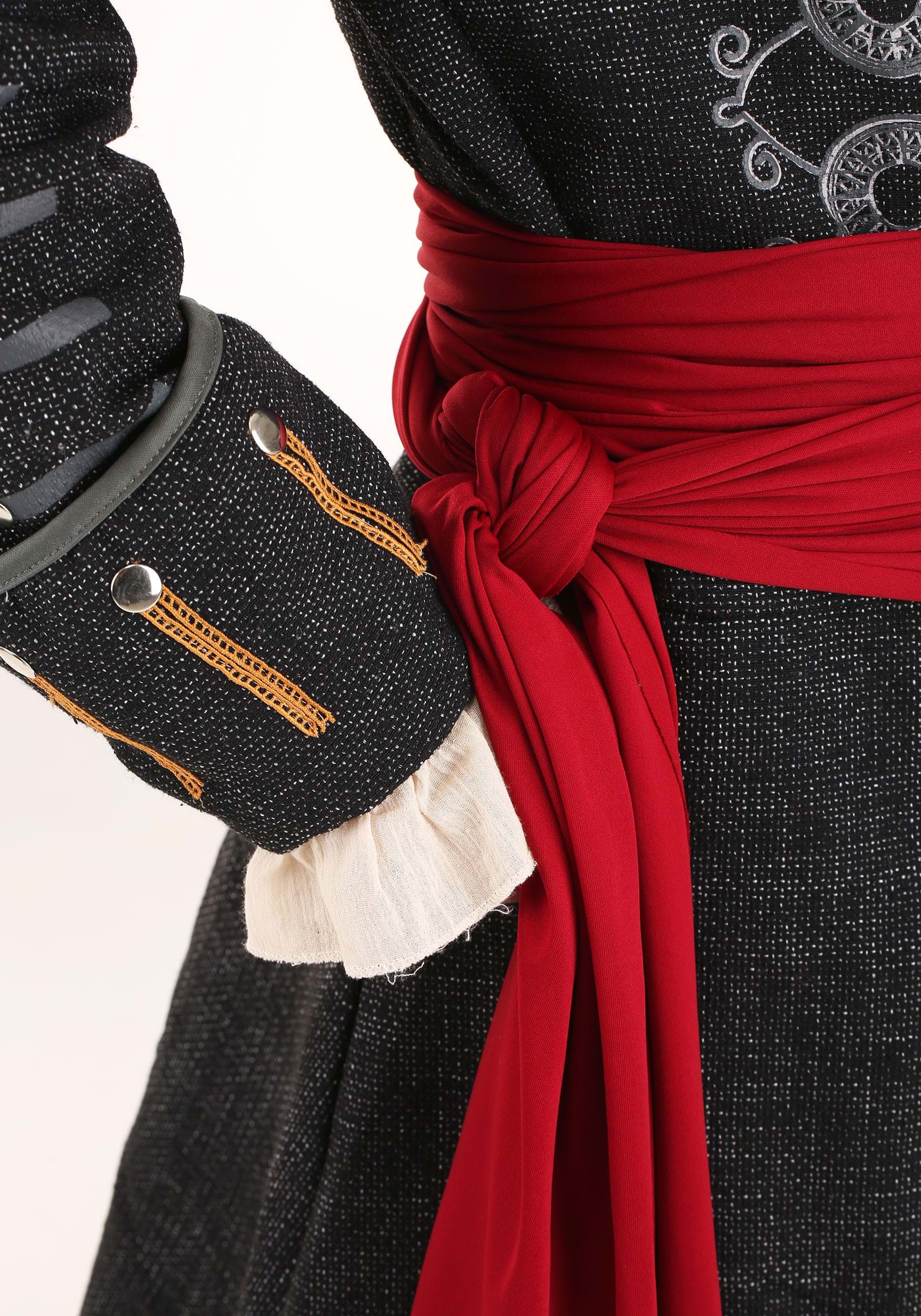 The woven jacket features screen printed details, and an attached false vest front truly emits the aura of a true captain, not like some of those other pirate costumes that make you look like some run of the mill cabin boy. The jabot adds an elegant touch, while the sash and cross belt add a touch of authenticity. The boot covers help turn a normal pair of shoes into buccaneer boots, while the hat puts the finishing touch on the look.