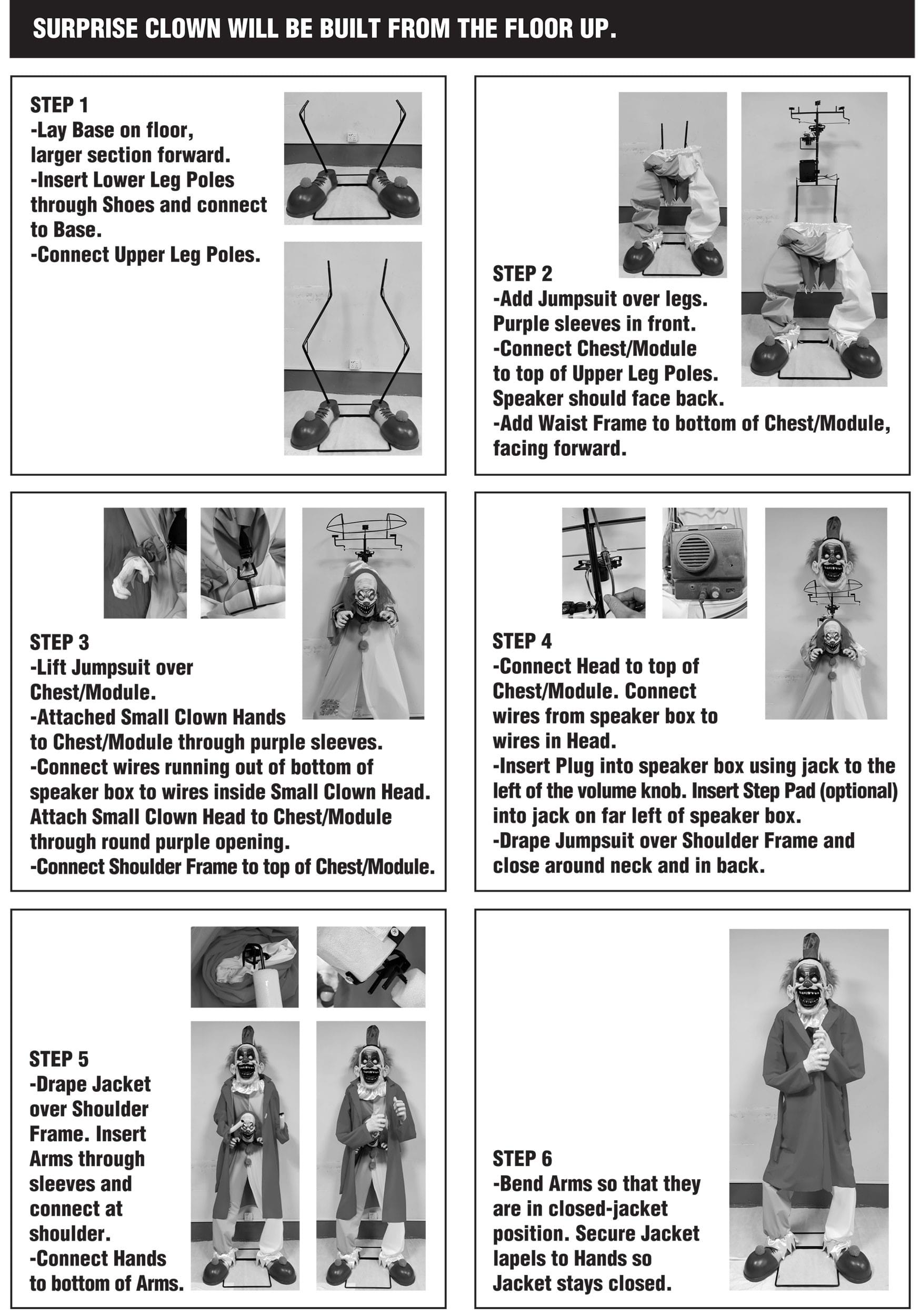 - When activated, eyes light up and jaw moves on each head, figure makes eerie sounds, and arms spread to open jacket and reveal small clown