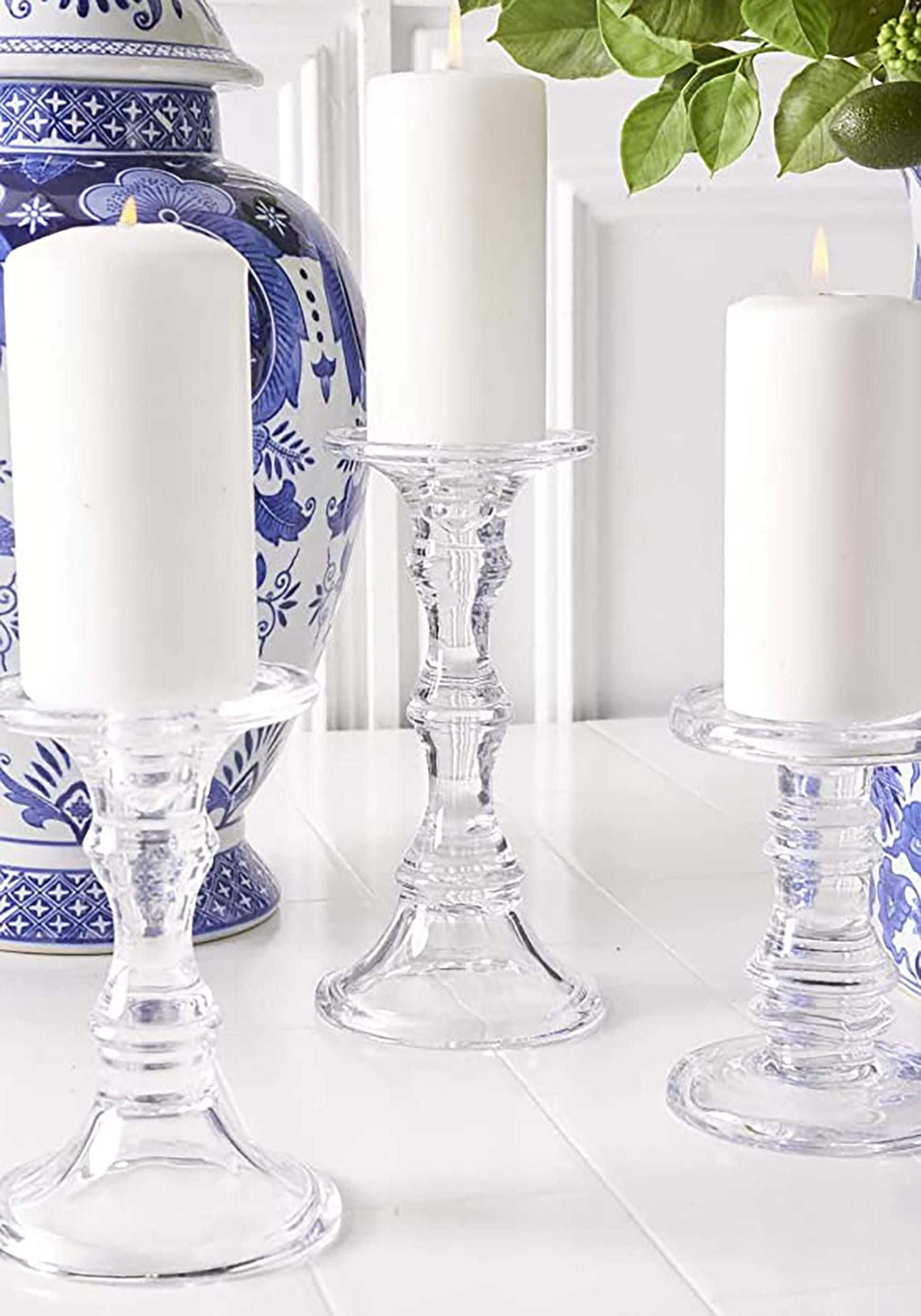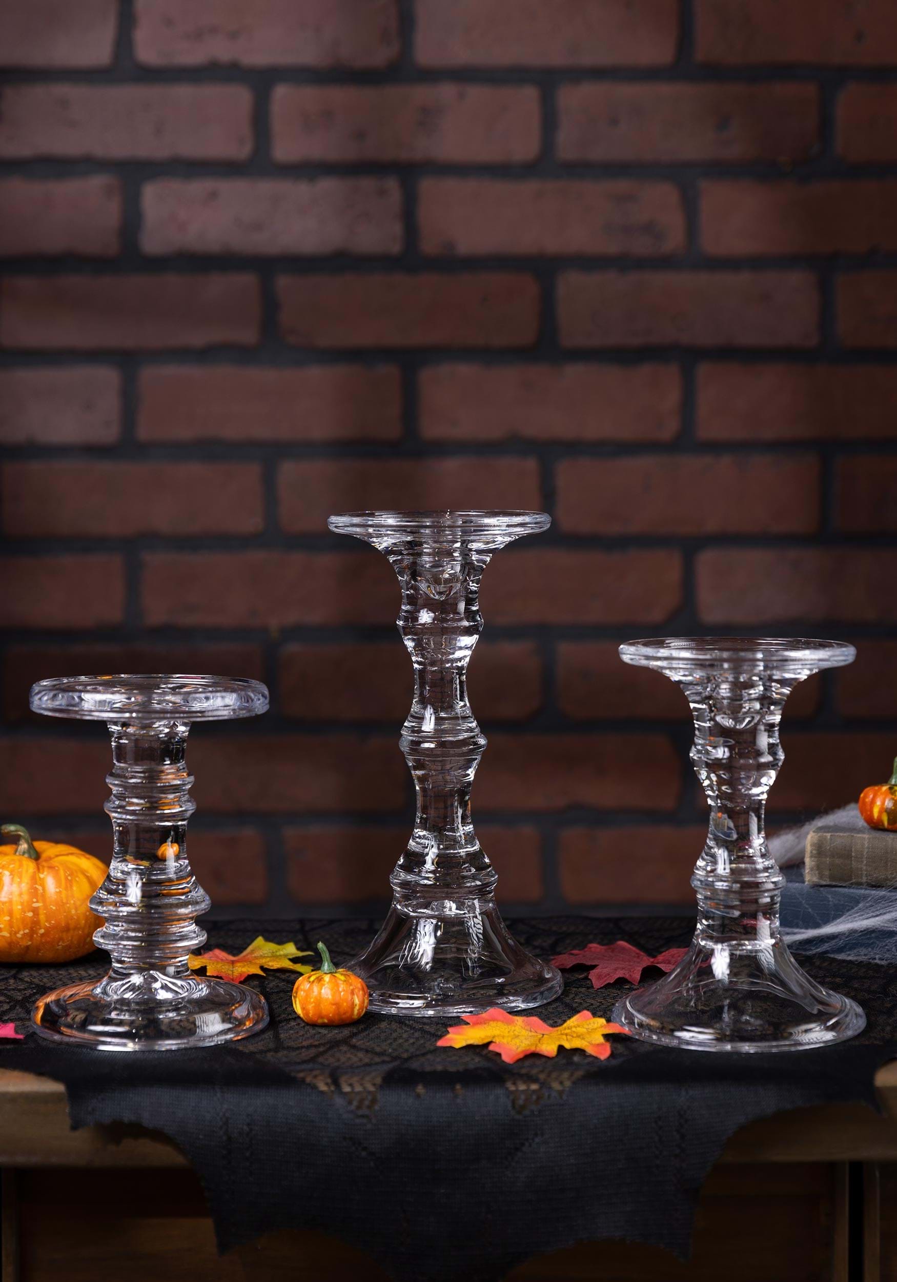 Your holiday décor shines bright no matter the season when you purchase this 3-pack of candlesticks! The holders have a traditional shape with a vintage feel making them an easy addition to any space. Meanwhile, their clear glass ensures they don't clash with classic holiday color combos and can sit among dark, bright, or pastel palettes. The top of each holder features a wide plate that easily holds pillar candles and helps prevent any wax from dripping onto other surfaces. Each holder stands at a different height to create a dynamic display when placed together while also allowing the set to be separated to fit specific areas.