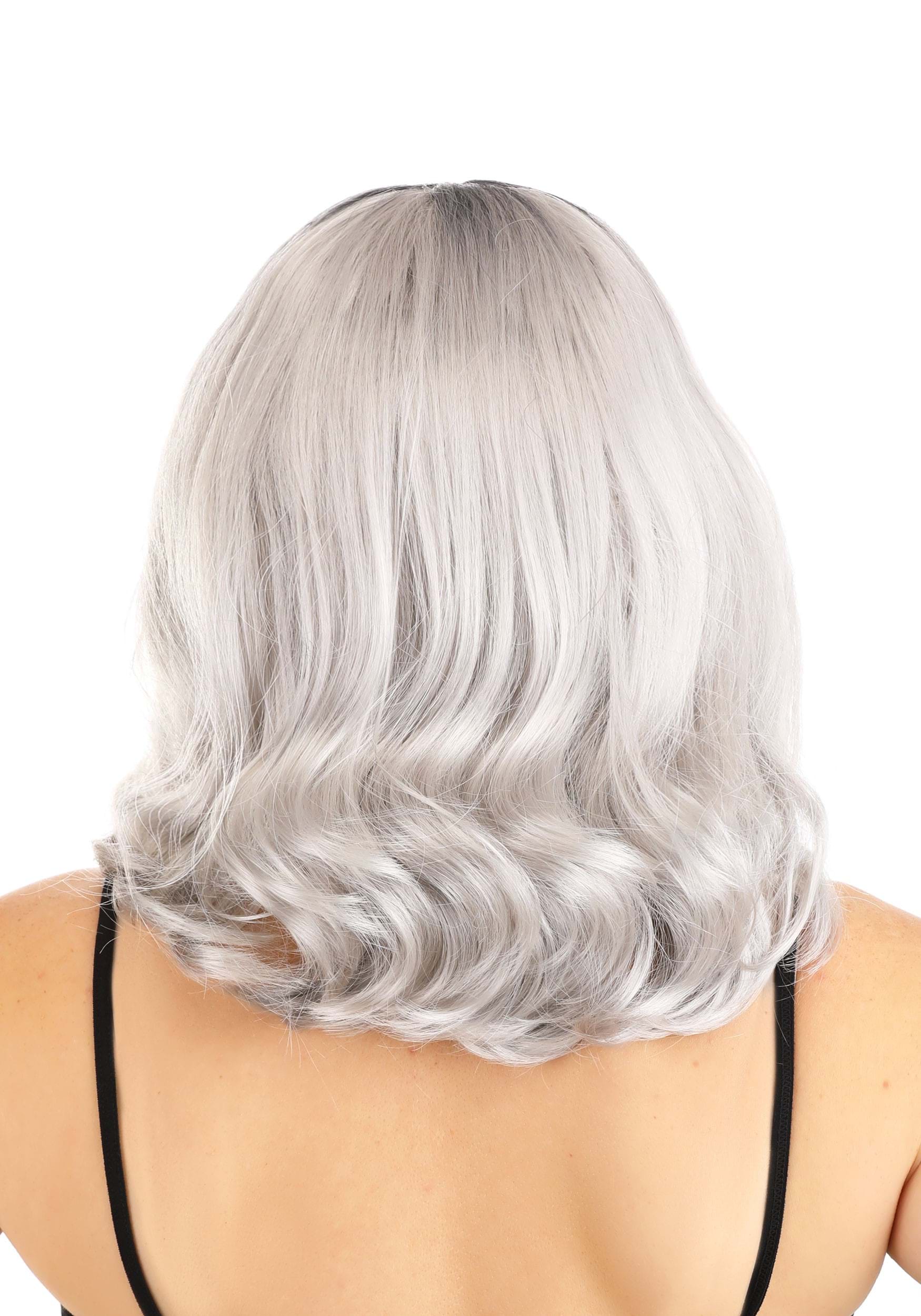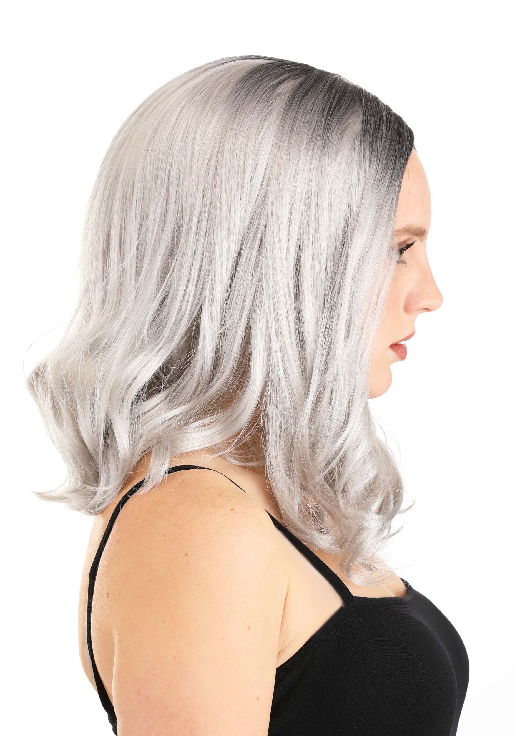 - Styled w/ center part & shoulder-length waves, ombre gradient from dark gray at part to almost white at ends