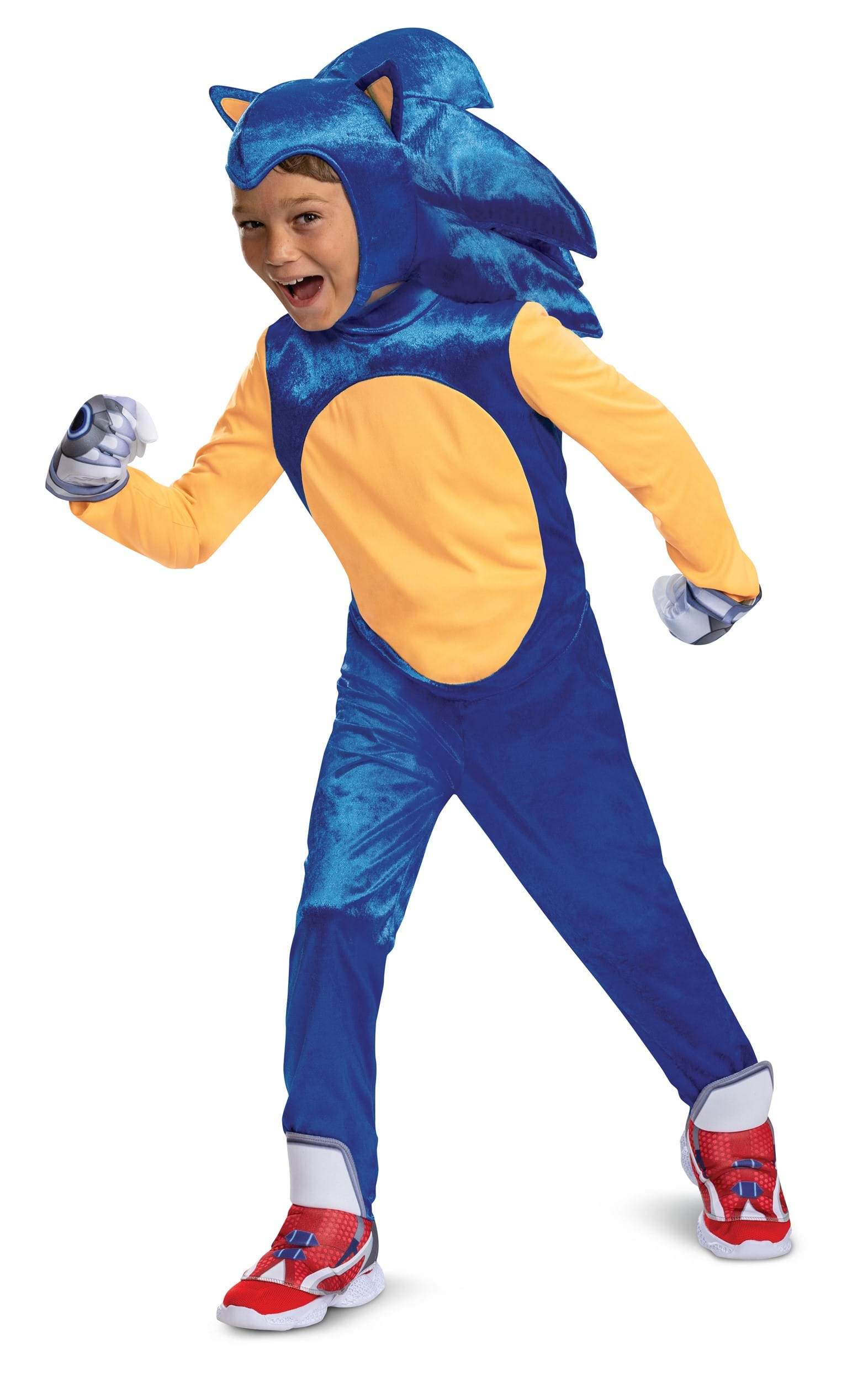 This jumpsuit has been designed to match Sonic's fun video game character design. His blue fur is made with a shiny blue fabric while the stomach and arms of the jumpsuit are made with a tan-colored fabric. A blue tail is attached to the back of the jumpsuit. This suit extends down to the classic red shoes that Sonic is seen wearing almost always.