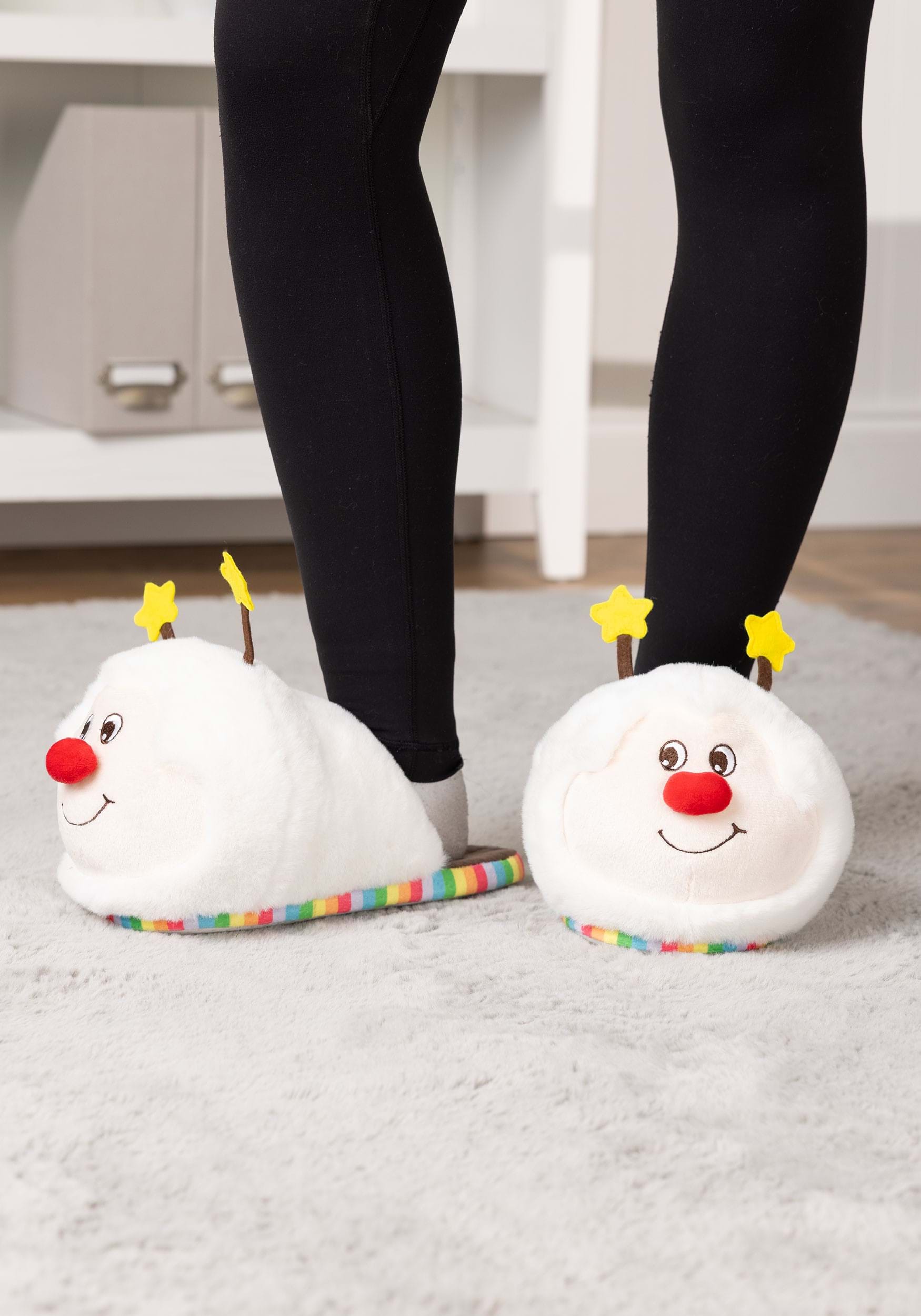 • Plush, fiber filled slippers have embroidered eyes and mouth