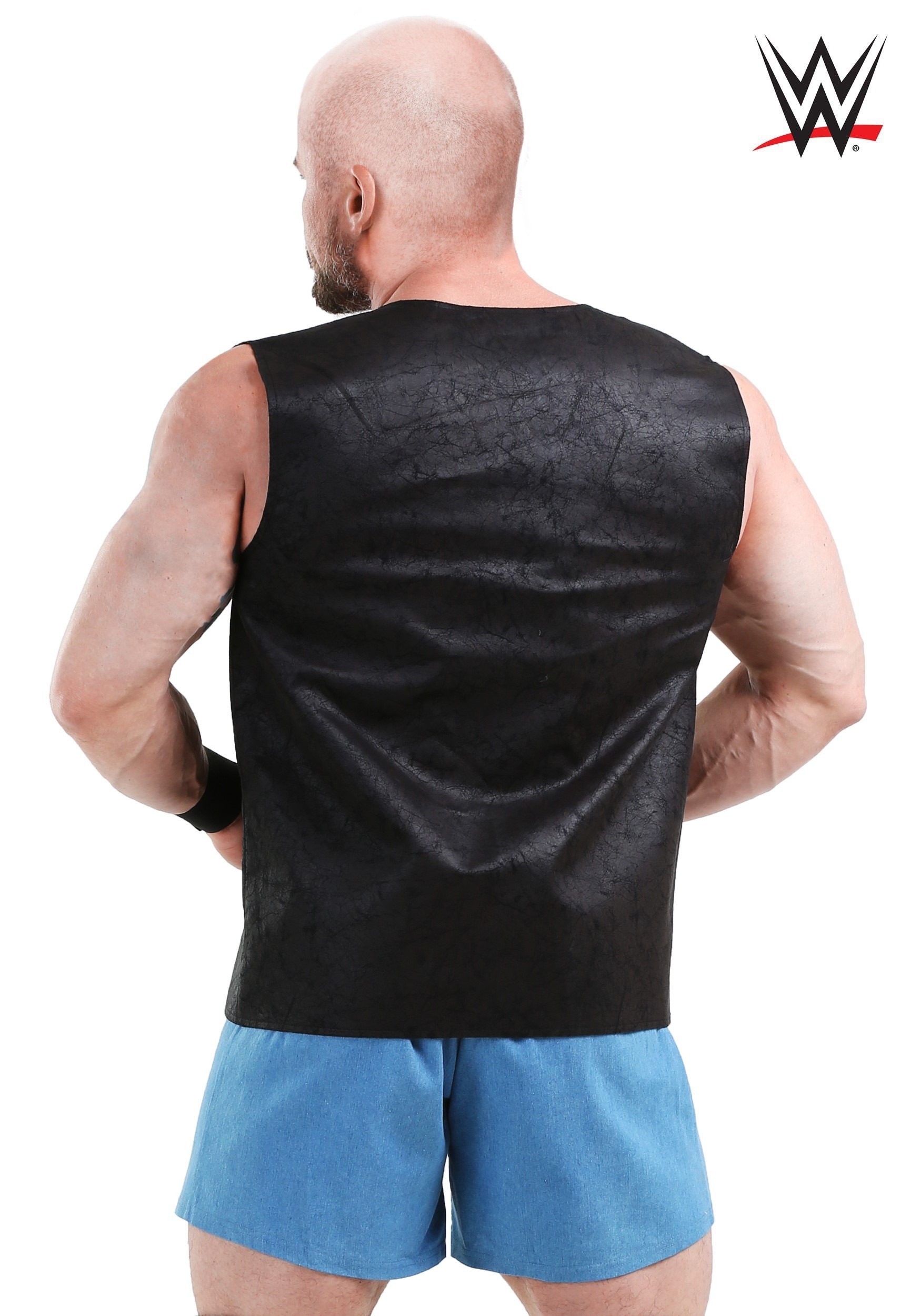 This costume includes a faux leather vest featuring related insignia, elastic waistband blue shorts, a pair of wristbands, black knee coverings, and a goatee. The jumpsuit is designed for comfort and authenticity, ensuring you look the part. The vest and shorts provide a realistic appearance, while the wristbands and knee coverings add to the overall effect. The goatee completes the look, making you feel like a true wrestling star.