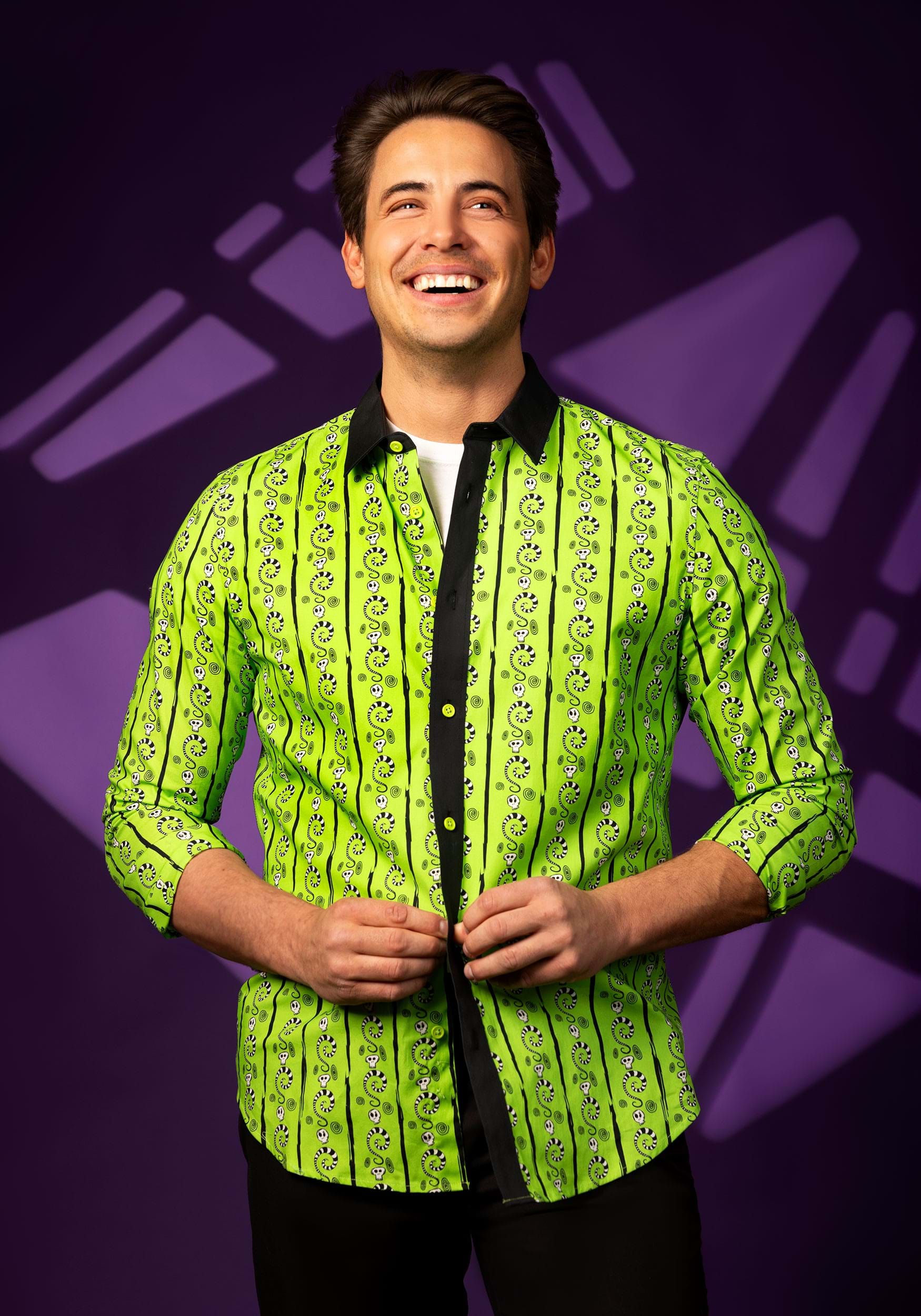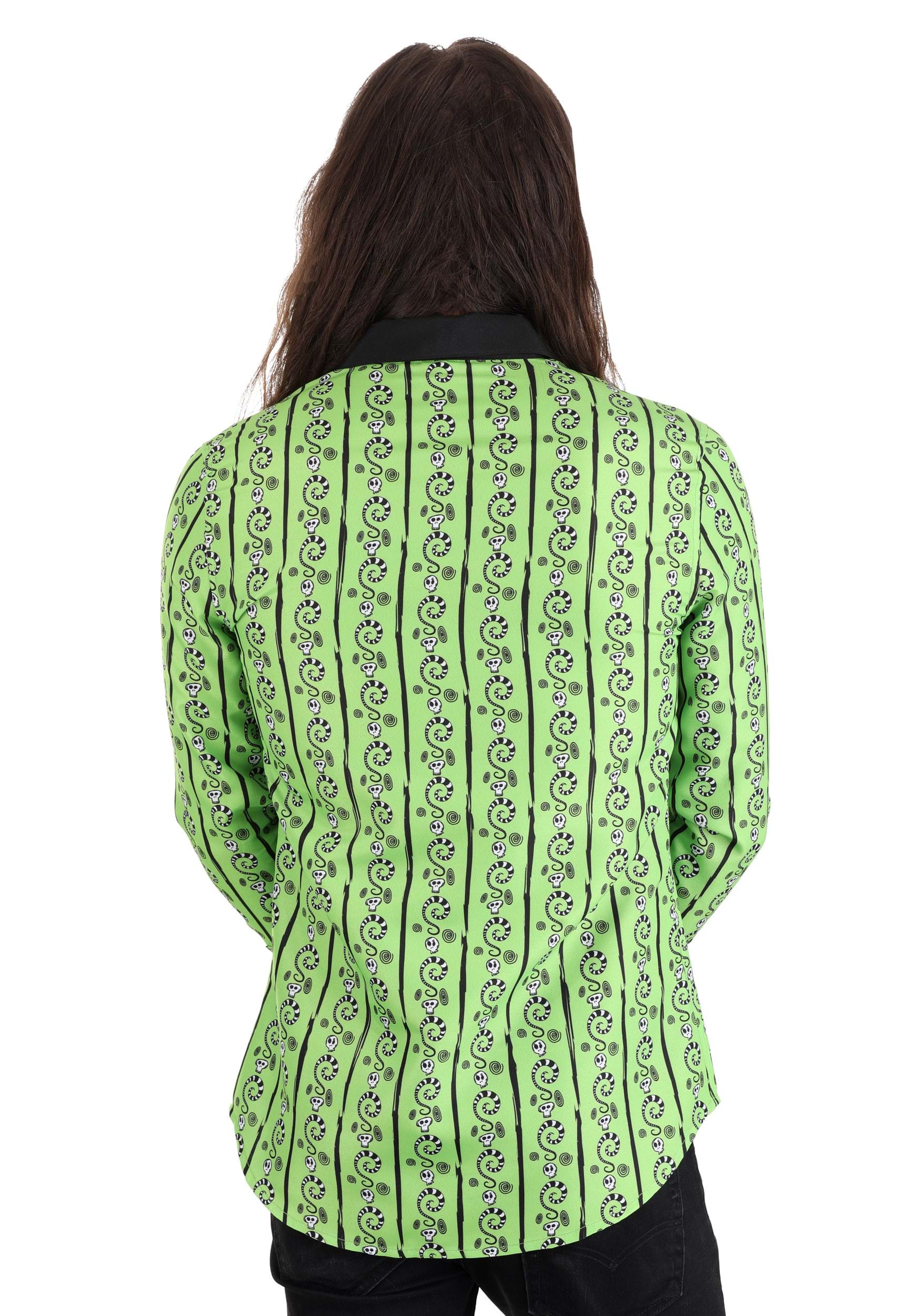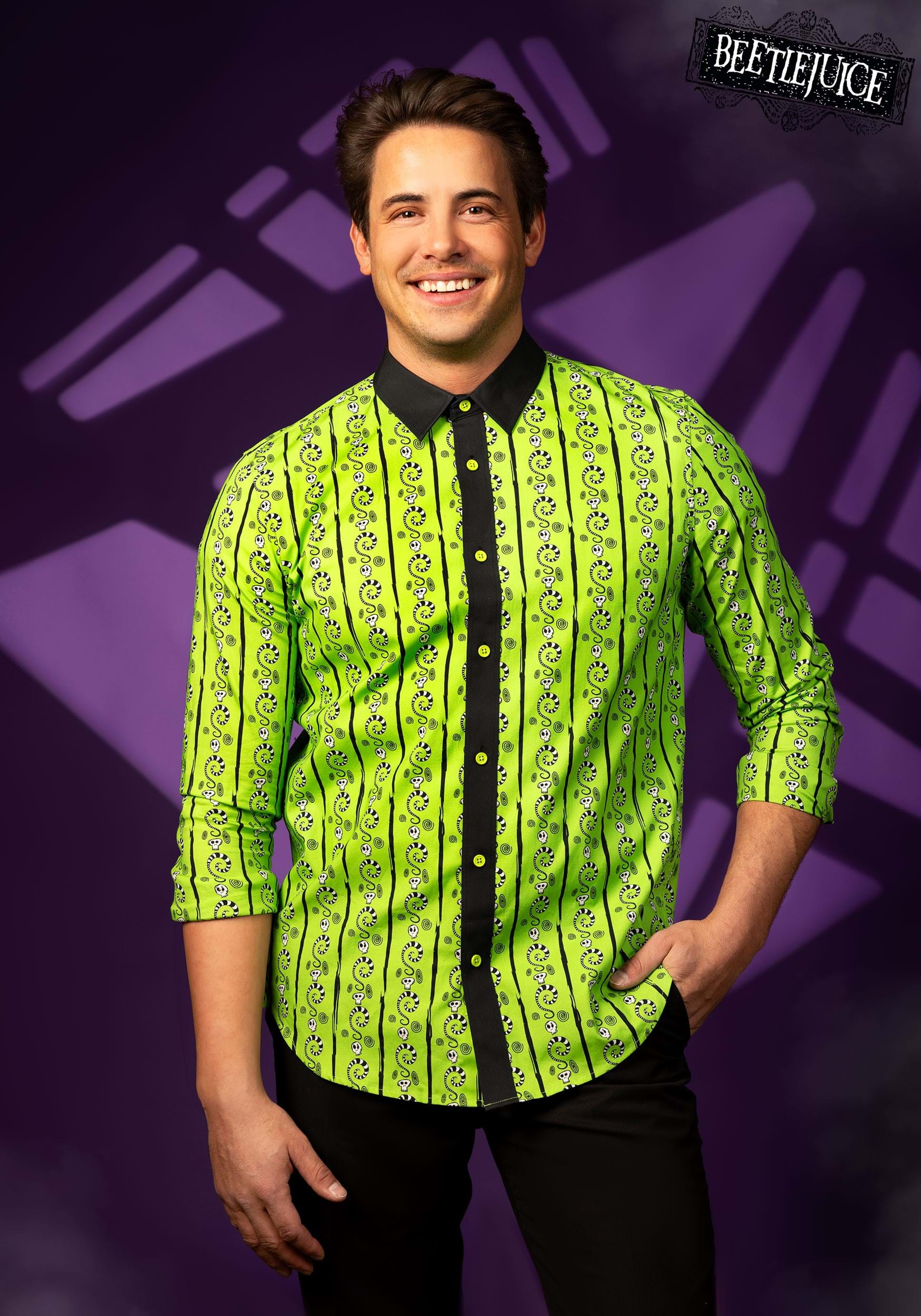 This is an exclusive Adult Stripes and Sandworms Beetlejuice Long Sleeved Shirt.