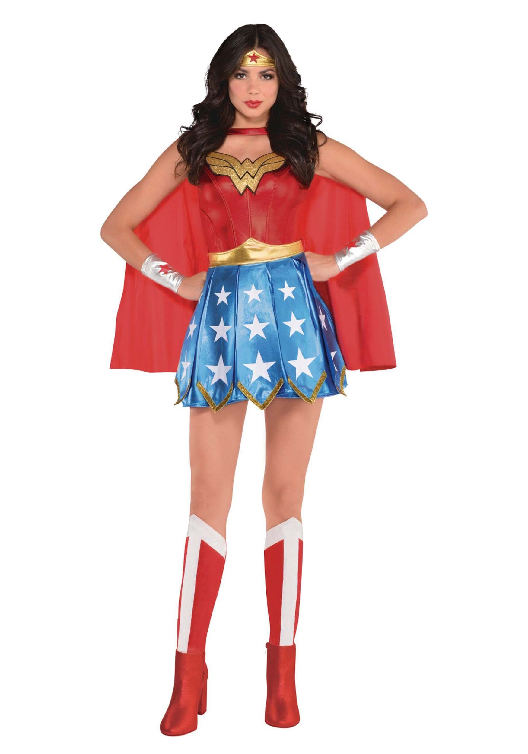The costume includes a full set of heroic essentials: a dress, cape, wrist gauntlets, leg warmers, and a headband. The red top of the dress features the classic gold Wonder Woman symbol across the bust, paired with a blue skirt that’s trimmed with white stripes and gold accents. An attached gold sash wraps around the waist, tying the whole ensemble together with a flash of regal flair.