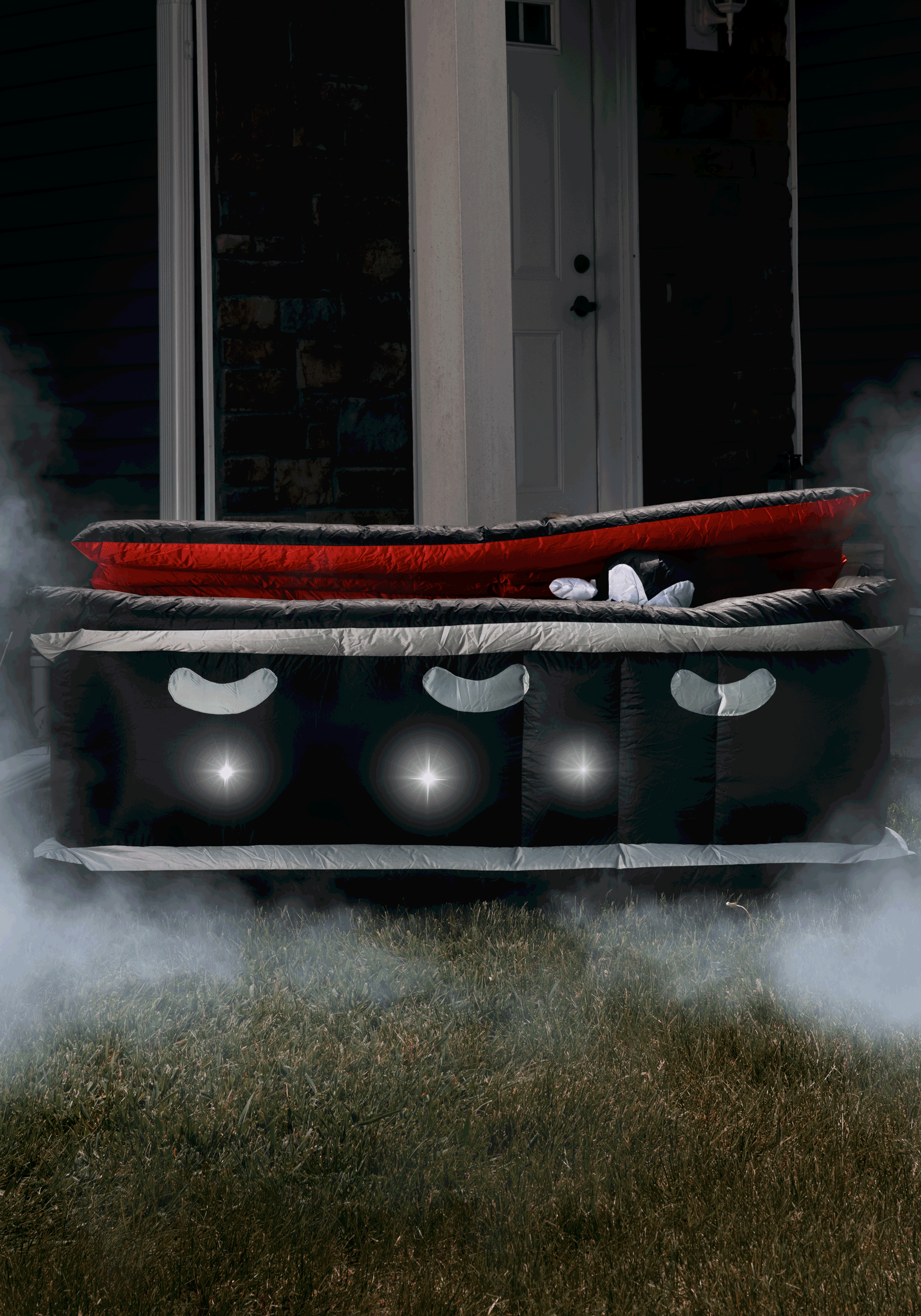 Once secured, the inflatable plugs into a standard US outlet to power its internal fan and give shape to the vampire and his cozy coffin. Keep the decoration plugged in to retain its shape and see the vampire rise to greet visitors from under the coffin lid while LED lights glow.