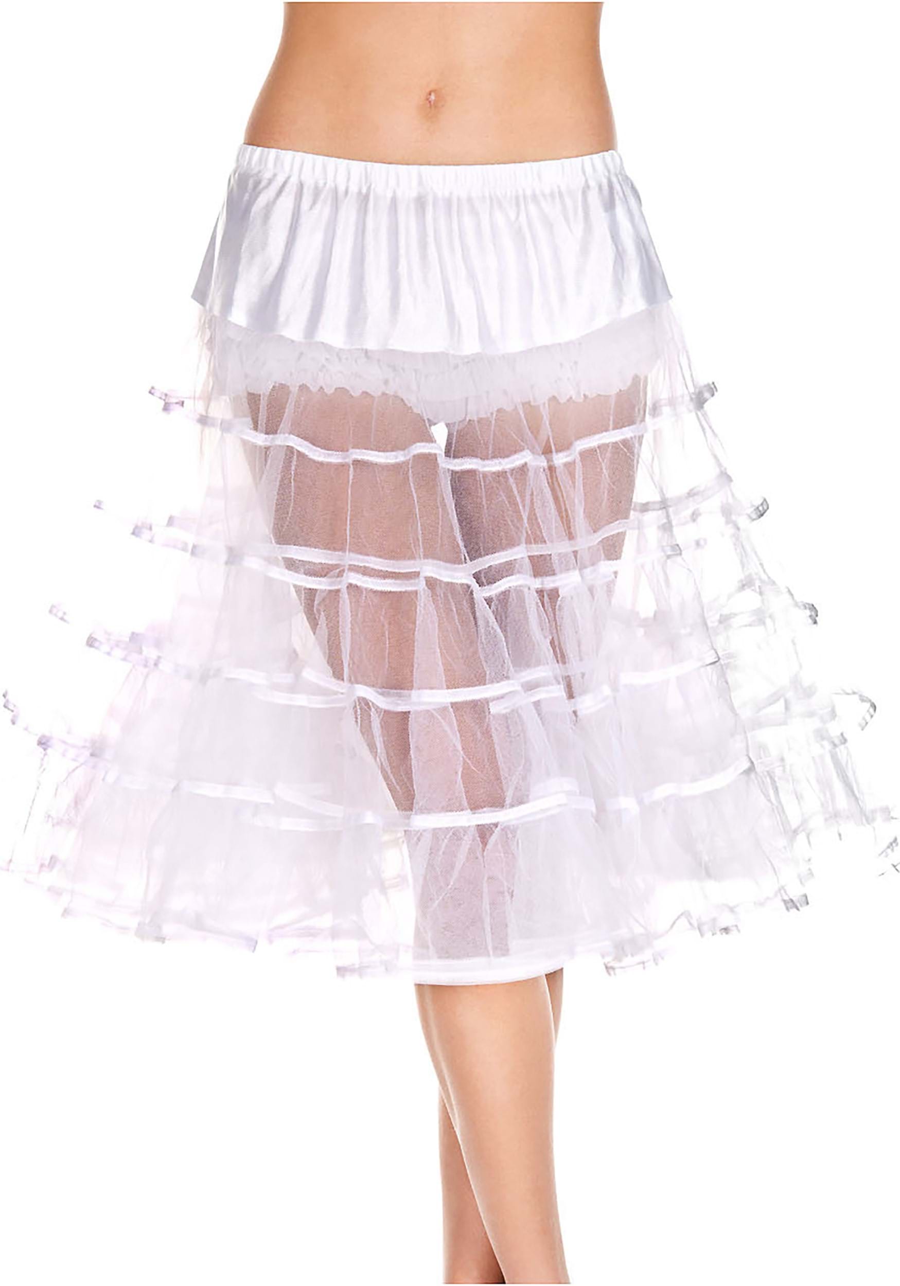 This Knee Length White Petticoat for Women is a gorgeous addition to your closet staples! It features a solid white waistband sewn with elastic to ensure a comfortable fit, and the skirt portion is made of sheer, ruffled mesh separated into segments by bands of white ribbon.