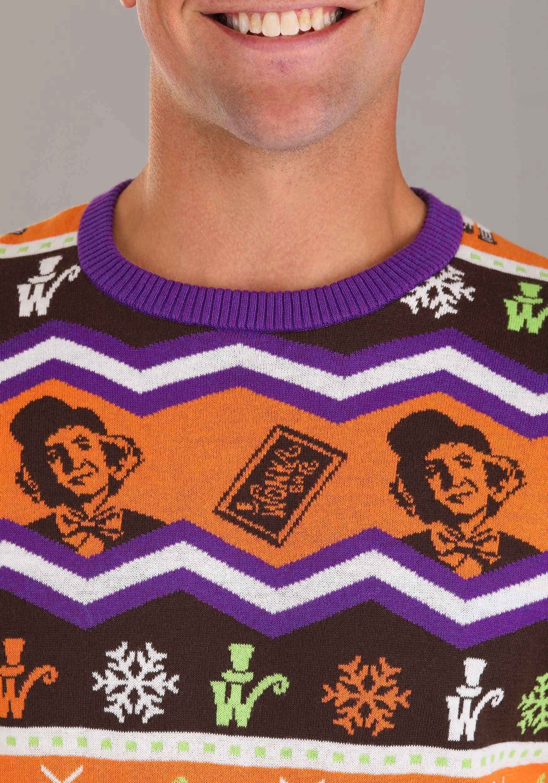 There was one expert team of costume and apparel makers that were up for the task of creating a Willy Wonka sweater, and it happened to be our own in-house team of designers. So, we're very proud to present our exclusive Willy Wonka Ugly Sweater for Adults!