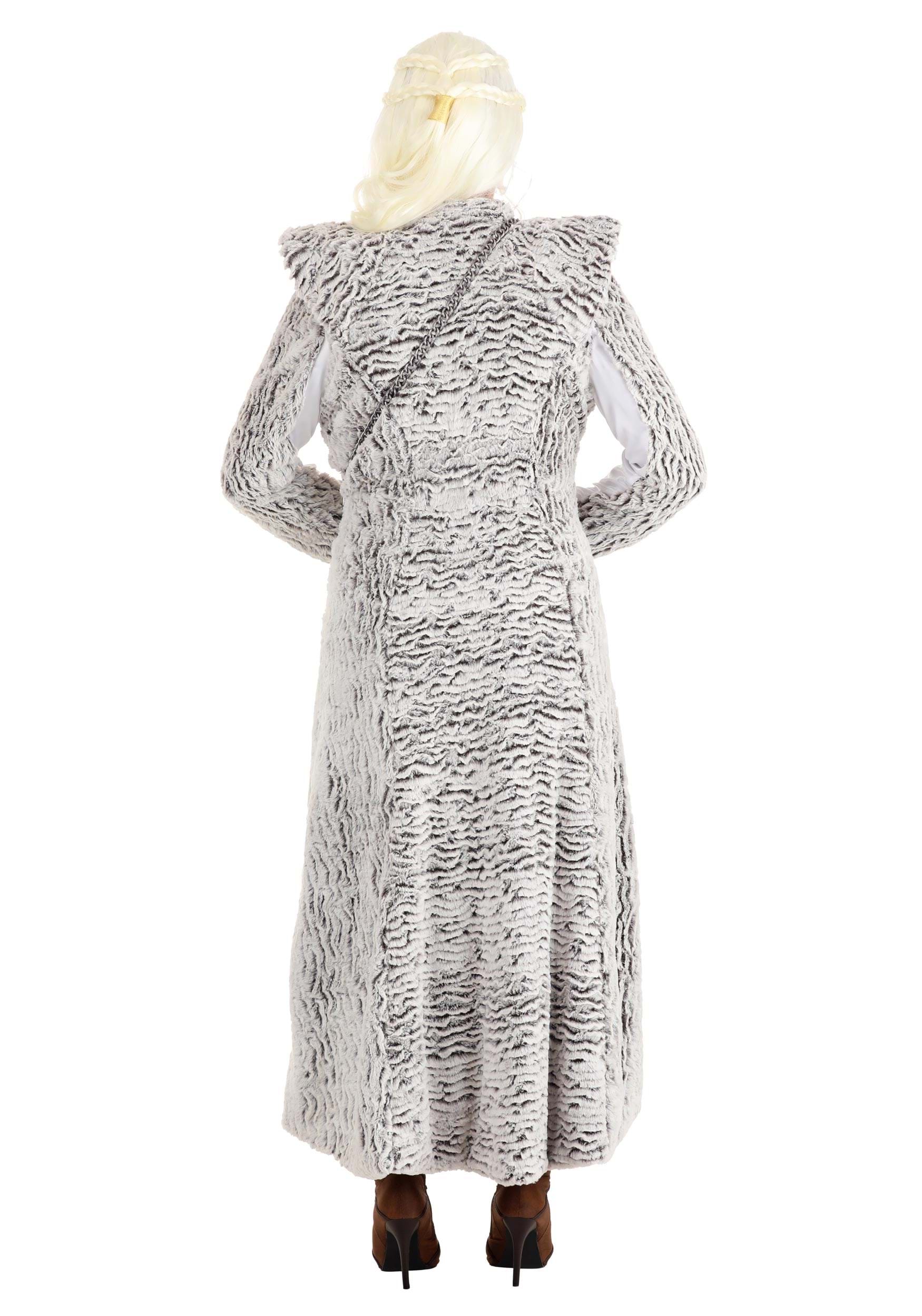 It is a long taupe and white coat of soft, Minky fabric with a tall neck collar and constructed shoulders. The costume is accented by large, ornate silver chains that drape around your shoulder and body with a large metal ring.