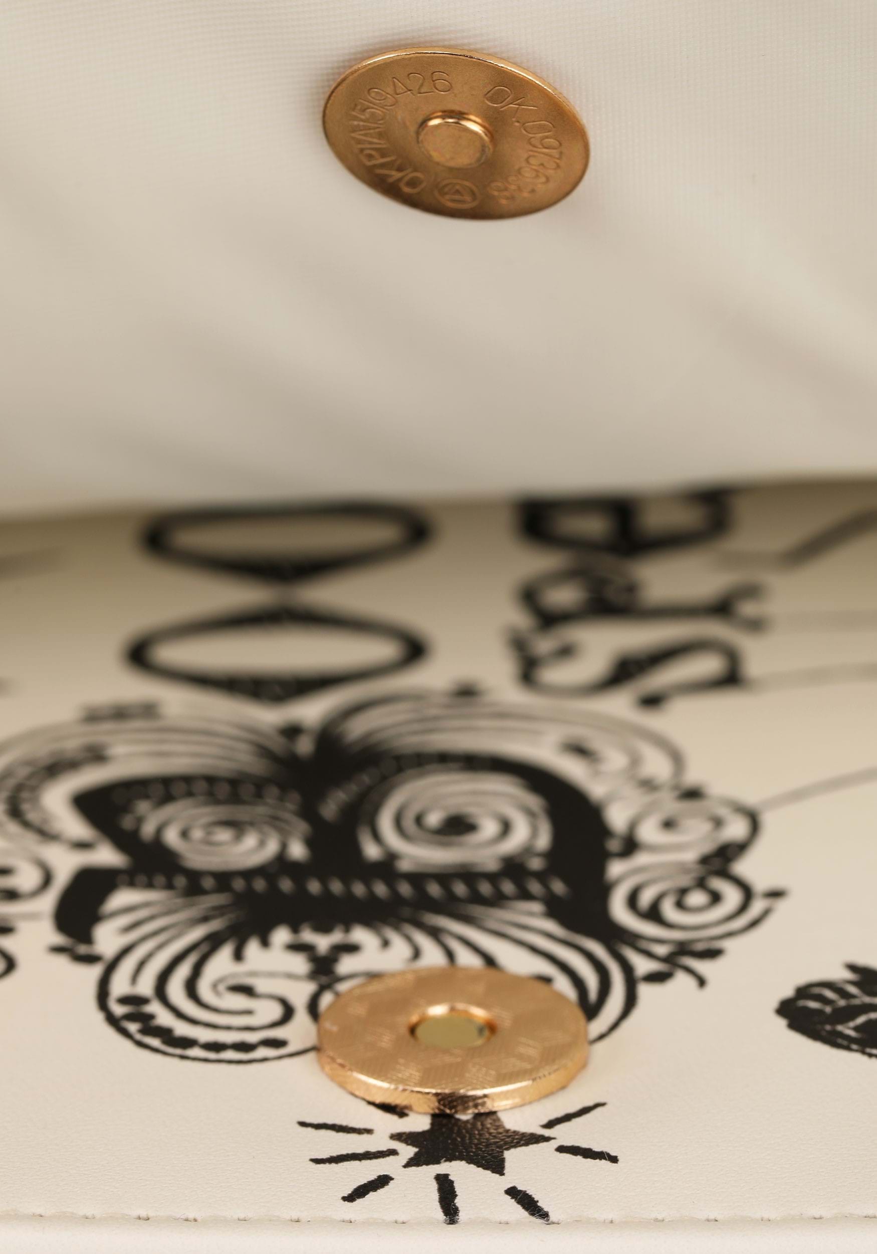 - Printed graphics, front flap fastens with magnetic snap, inner pocket with zipper closure
