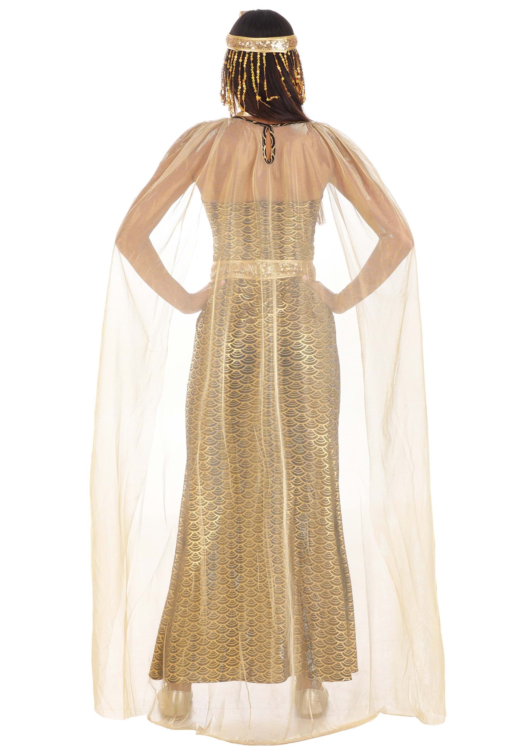 This sleek costume has a full-length dress with a shimmering printed snakeskin pattern. Form-fitting with a slit in the skirt for a modern twist, this Cleopatra costume is sure to make an impression at any costumed event. Gorgeous details designed by our creative team such as the sequined belt, the colorful collar, and the sheer cape sets this royal look apart.