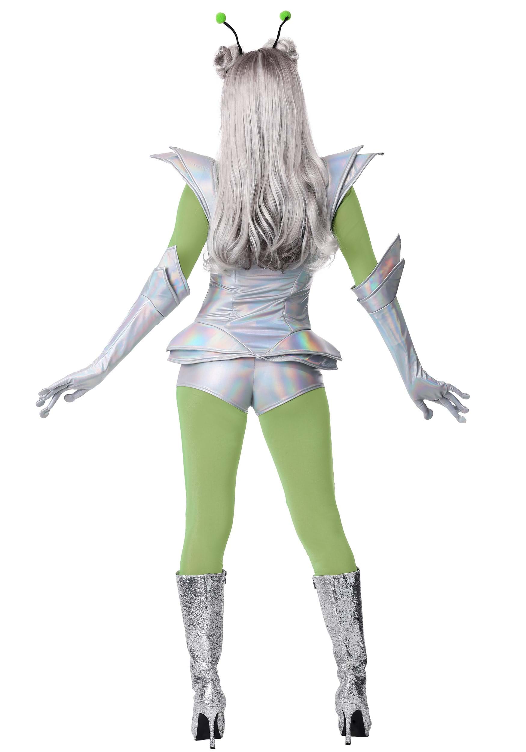 This costume is a Made by Us exclusive, designed right here in our own costume studios. It comes with a green top and leggings, to give you the appearance of being a green-skinned alien lady. A metallic shiny romper goes on top, secured in the front with a center zipper. Gloves and an antennae headband complete the style, and you can get the look as we have it pictured by adding silver boots, a silver wig, and green face paint. And a toy blaster if you're so inclined! (Accessories sold separately.)