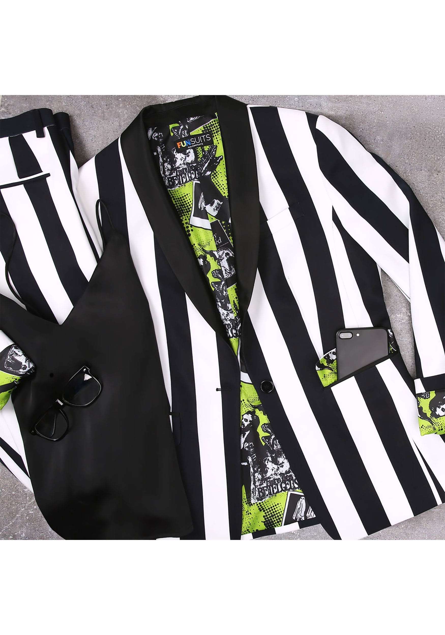 Working some creepy chic touches into your workweek wardrobe is a whole lot of fun with this Beetlejuice blazer. The relaxed fit and shawl collar pairs easily with a variety of clothing from dressy to casual. Pairing the striped jacket with the Beetlejuice suit pants is a look that can’t be beat.