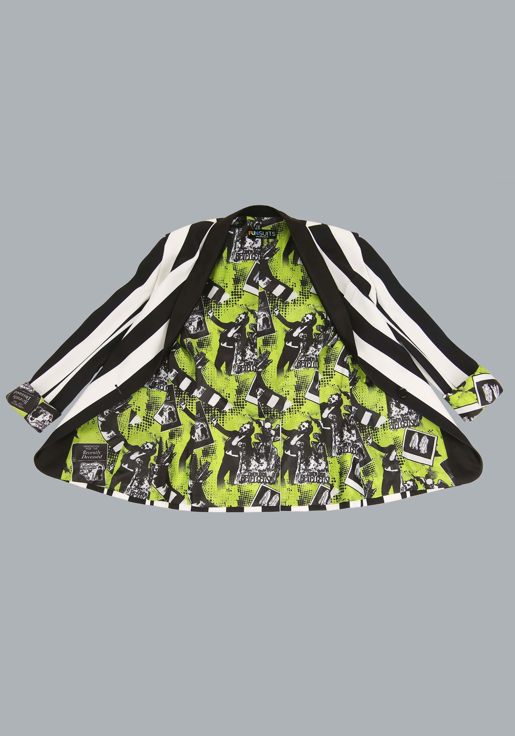 Lined with an eerie green that’s patterned with illustrated images from the movie such as sandworms, Beetlejuice himself, and the Handbook for the Recently Deceased, this jacket is definitely not ordinary in any sense of the word. Slipping into this unique jacket will bring your Halloween look from the boardroom to a ghoulish get-together at a moment’s notice!