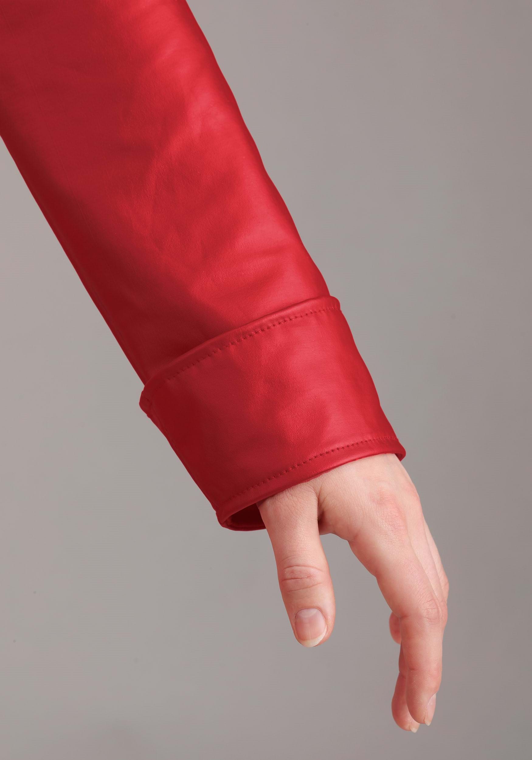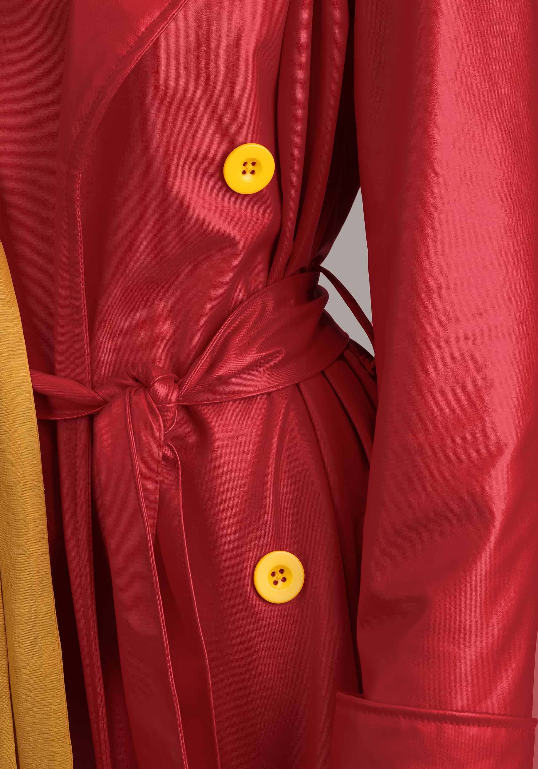 - 4 way stretch spandex jacket has plastic buttons down center front, attached belt ties as desired