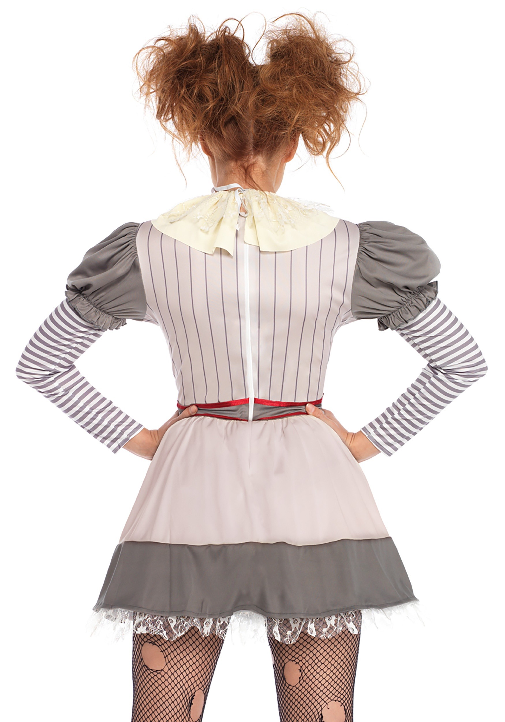 The creams and grays of this costume make it look timeless. The back zippered dress has a cute, flouncy skirt. The dress waist has red satin trim. The top is wild with red poufs up the front and puffed sleeves layered over the striped sleeves. The dress is topped with a ruffle around the neck and lace overlay on top.