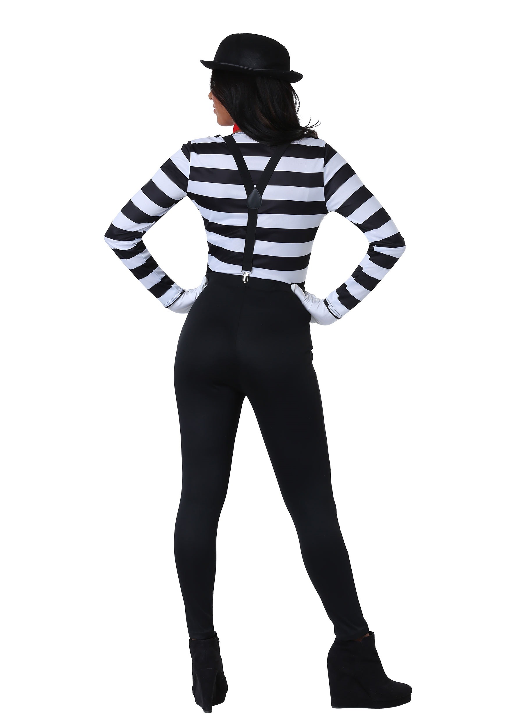 This exclusive female mime costume is sure to make you feel both playful and classic. Designed by our in-house creative team, we paired a timeless black and white striped shirt with double-buttoned high-waisted leggings. The suspenders let you pull off quintessential mime poses for the camera. The ensemble is topped off with a red scarf and bowler hat that would look right at home on the cobblestone streets of Paris.