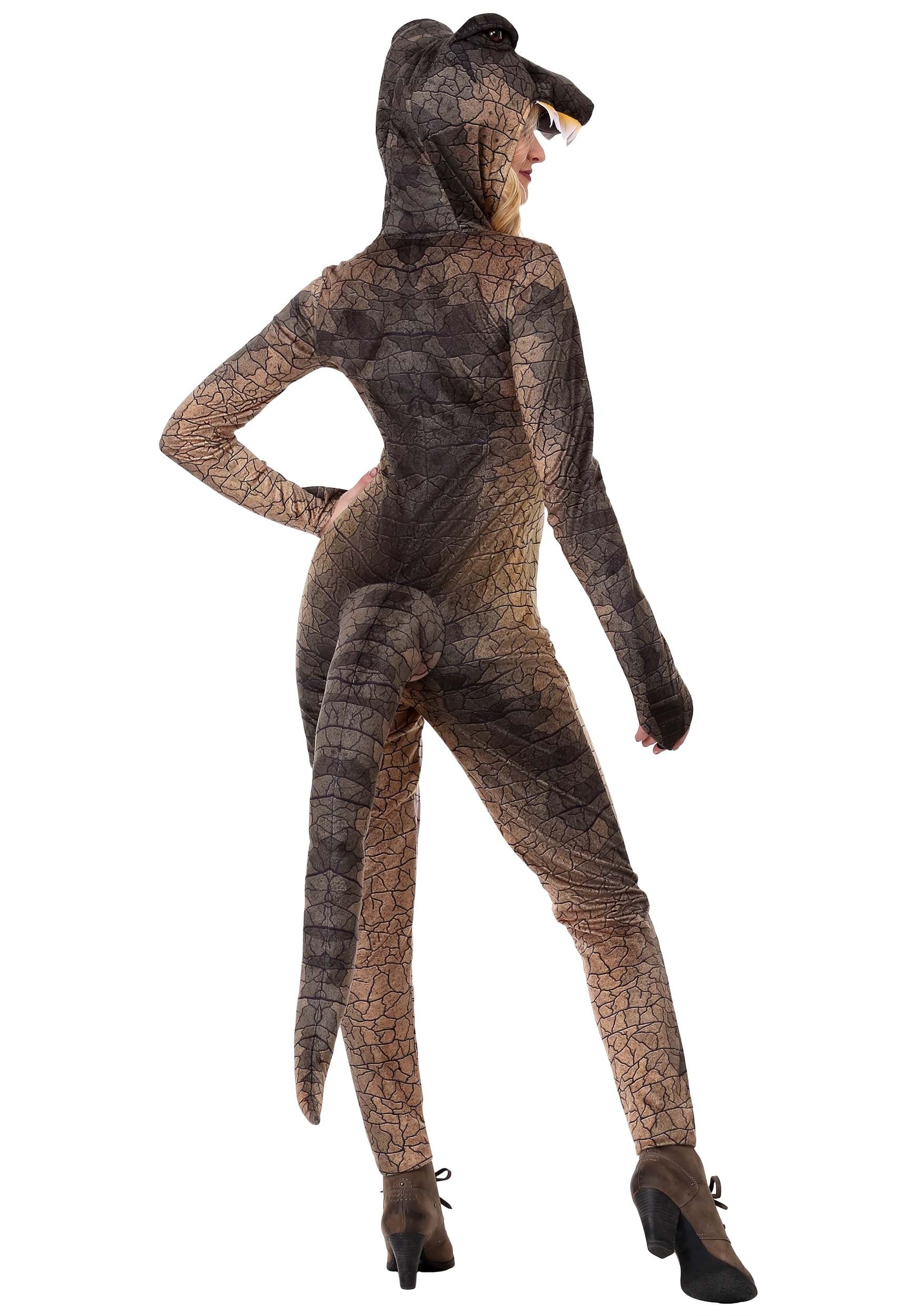 This Women's Deadly Dinosaur Costume is a Made by Us costume exclusively available here at HalloweenCostumes.com. Styled as a hooded jumpsuit, it has a stuffable tail, and a fun hood with eyes and fabric teeth. You will indeed need to supply your own roar but all that takes is a little bit of practice!