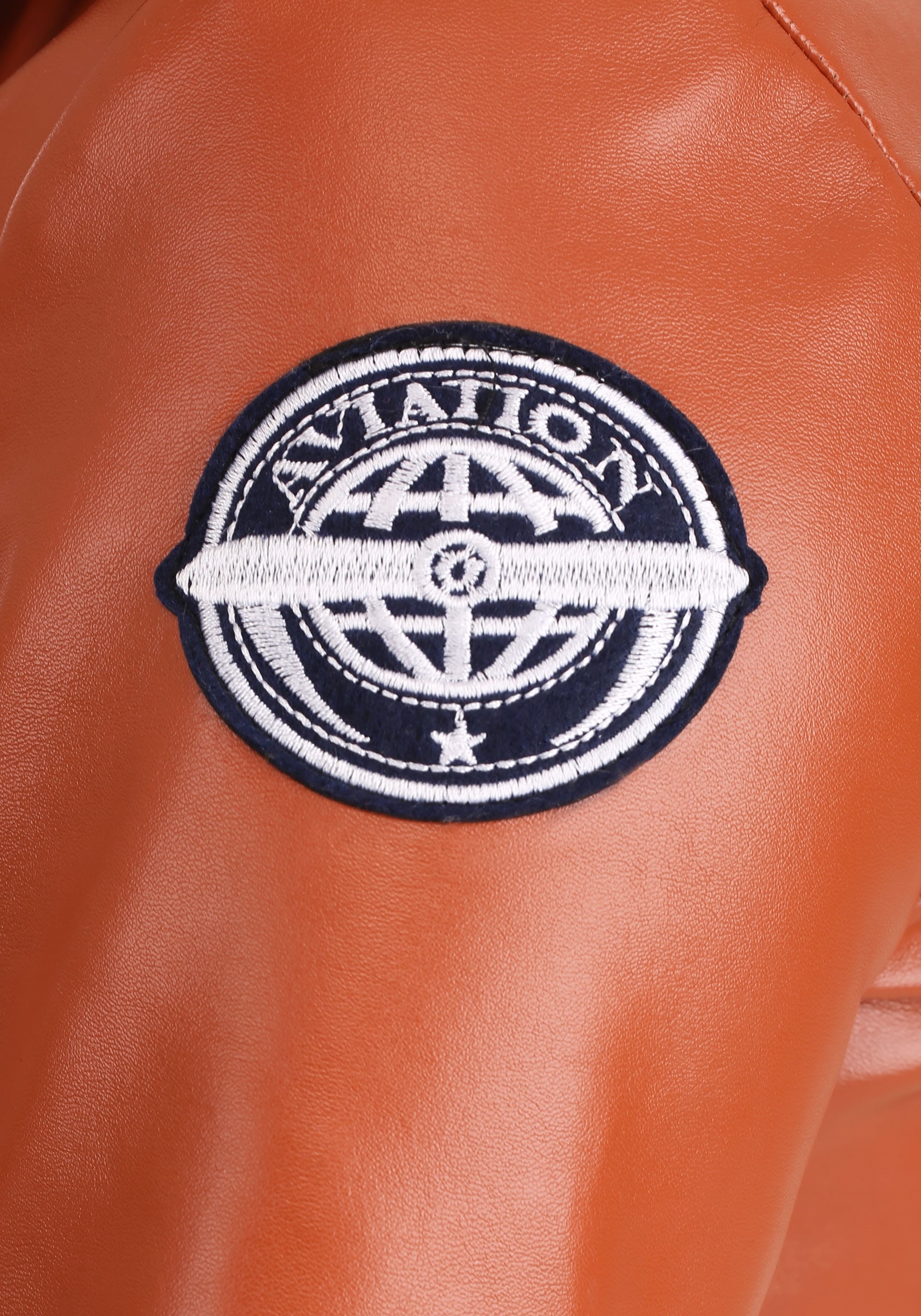 - Jacket has separating front zipper, sherpa collar, embroidered patches on both sleeves