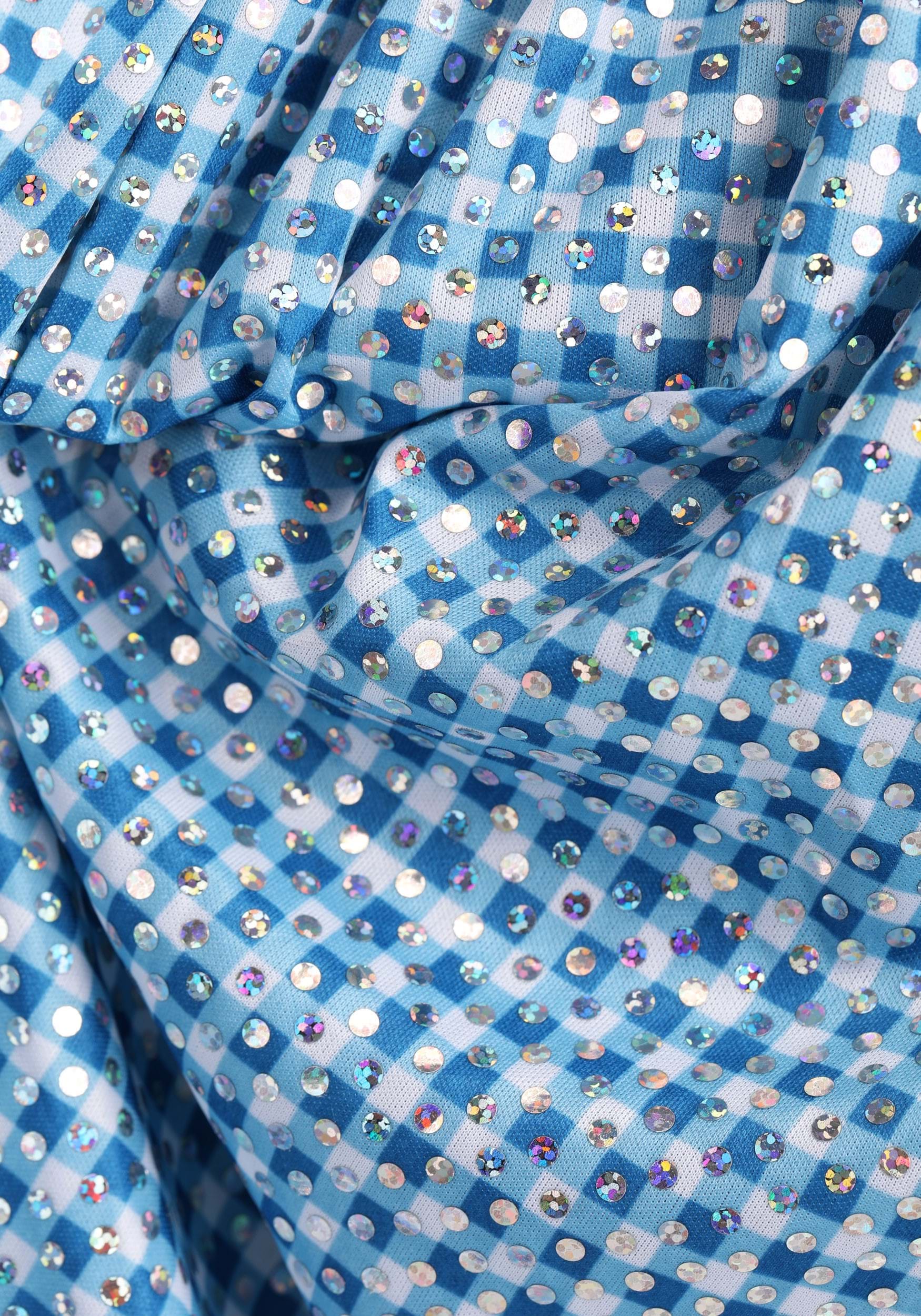 - Pinafore is covered with iridescent sequins over gingham printed jersey knit; shoulder straps are anchored by decorative buttons