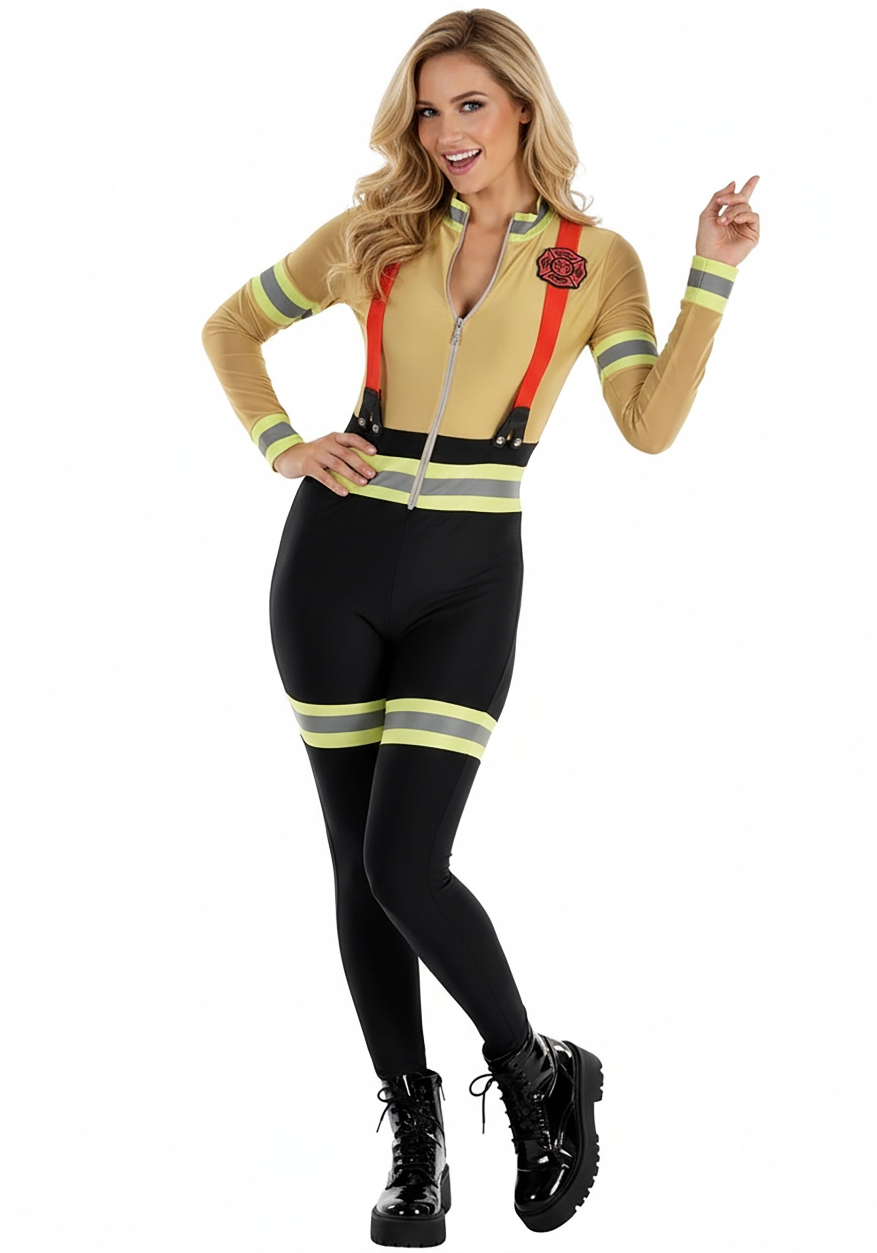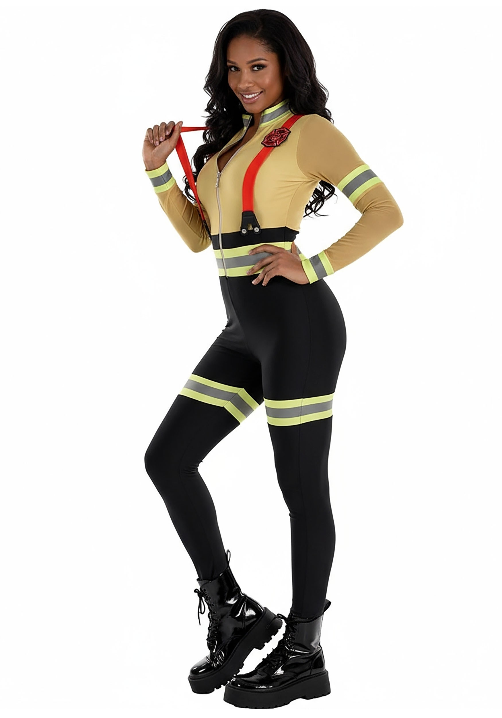 This firefighter-inspired jumpsuit is designed for a sleek, form-fitting look with just the right amount of stretch—because saving the day should never feel restrictive. The tan top half is styled like a traditional firefighter coat, complete with yellow and reflective stripes on the sleeves, wrists, waist, and thighs. The bottom half transitions to black, creating that classic firefighter uniform contrast.