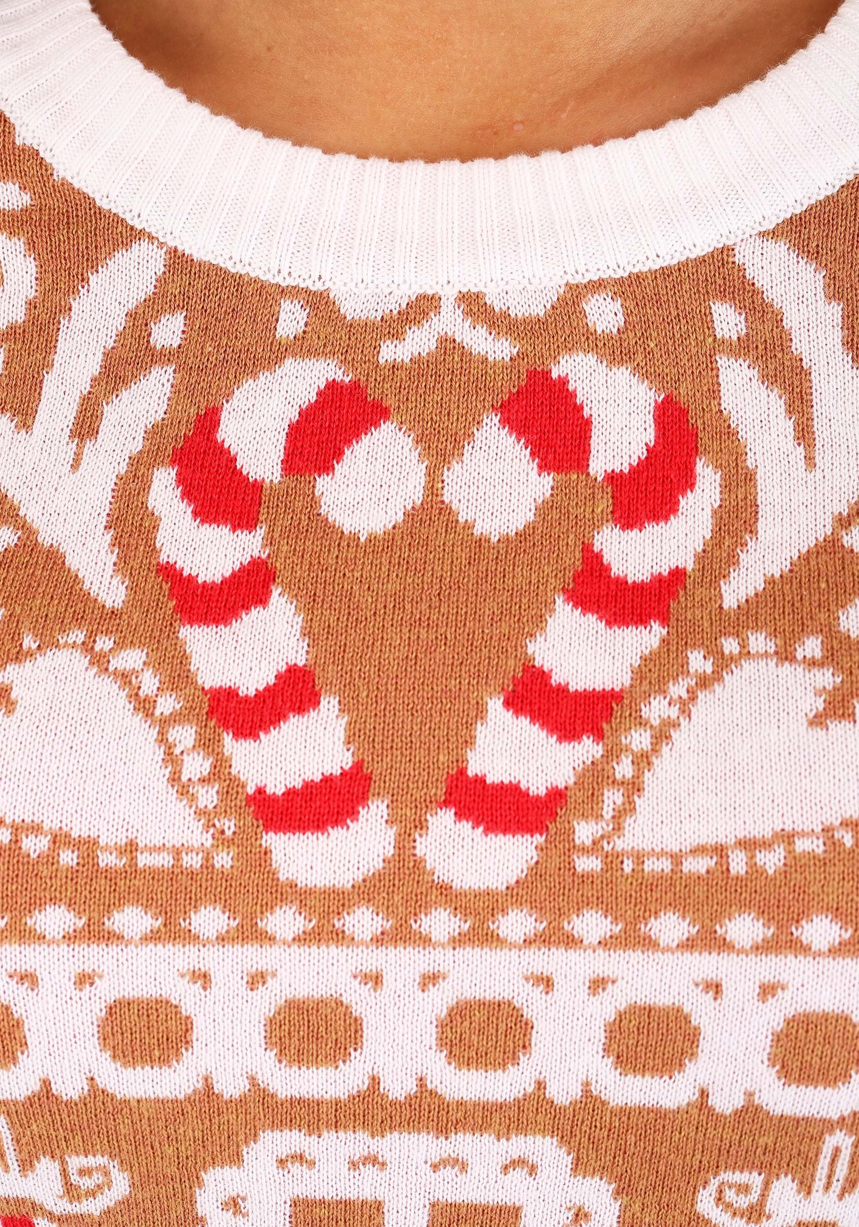 This women's holiday sweater brings you a cozy style just in time for Christmas. Knitted from 12-gauge yarn, it's made from a comfy cotton and acrylic blend and has a knit-in design that will have you looking like a freshly baked gingerbread house! It even has "frosting" style patterns on the front and along the sleeves. It even has red and green accents to help bring a splash of holiday colors into the look. It's the best way to mix all of your favorite holiday traditions!