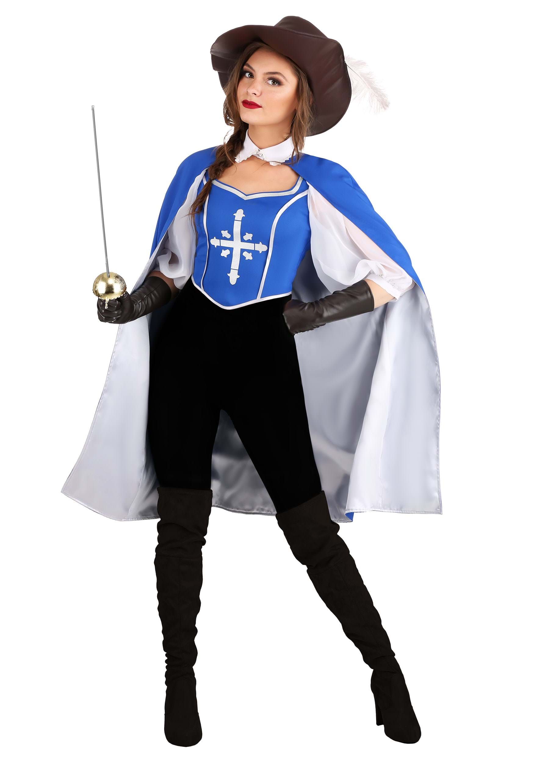 Fight for France in this exclusive Women's Musketeer Costume. The outfit is made of the the finest 100 percent polyester fabrics and looks just like a uniform of one of the king's elite guard! The blue pullover shirt has a jersey knit back panel, poplin front panel and white gathered chiffon sleeves with elastic at the cuffs. There are printed Musketeer-style graphics on the shirt front, while there's also a dashing blue cape with white silver lining. The cape fastens with a metal snap at the front of a lace-edged collar and is perfect for swishing theatrically during every sword fight! The costume also comes with fashionable black faux leather gloves with wide, flared cuffs, as well as a heroic Musketeer hat! The black hat is foam-backed and has a turned up brim, along with a charming feather on the side. (Toy sword, leggings and boots sold separately.)