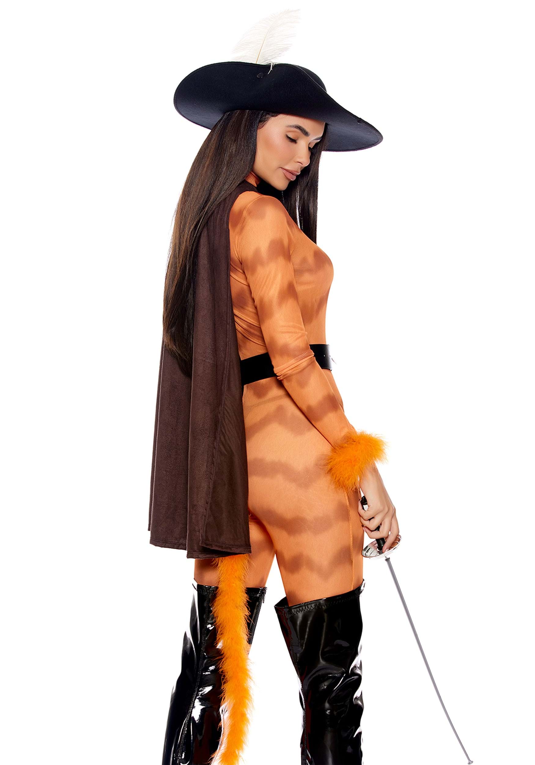 A subtle all-over tabby stripe print adds a fierce feline spirit to the costume jumpsuit. Worried about coverage? This costume includes a soft stretch-knit panty, ensuring an added layer of comfort and strategic coverage.