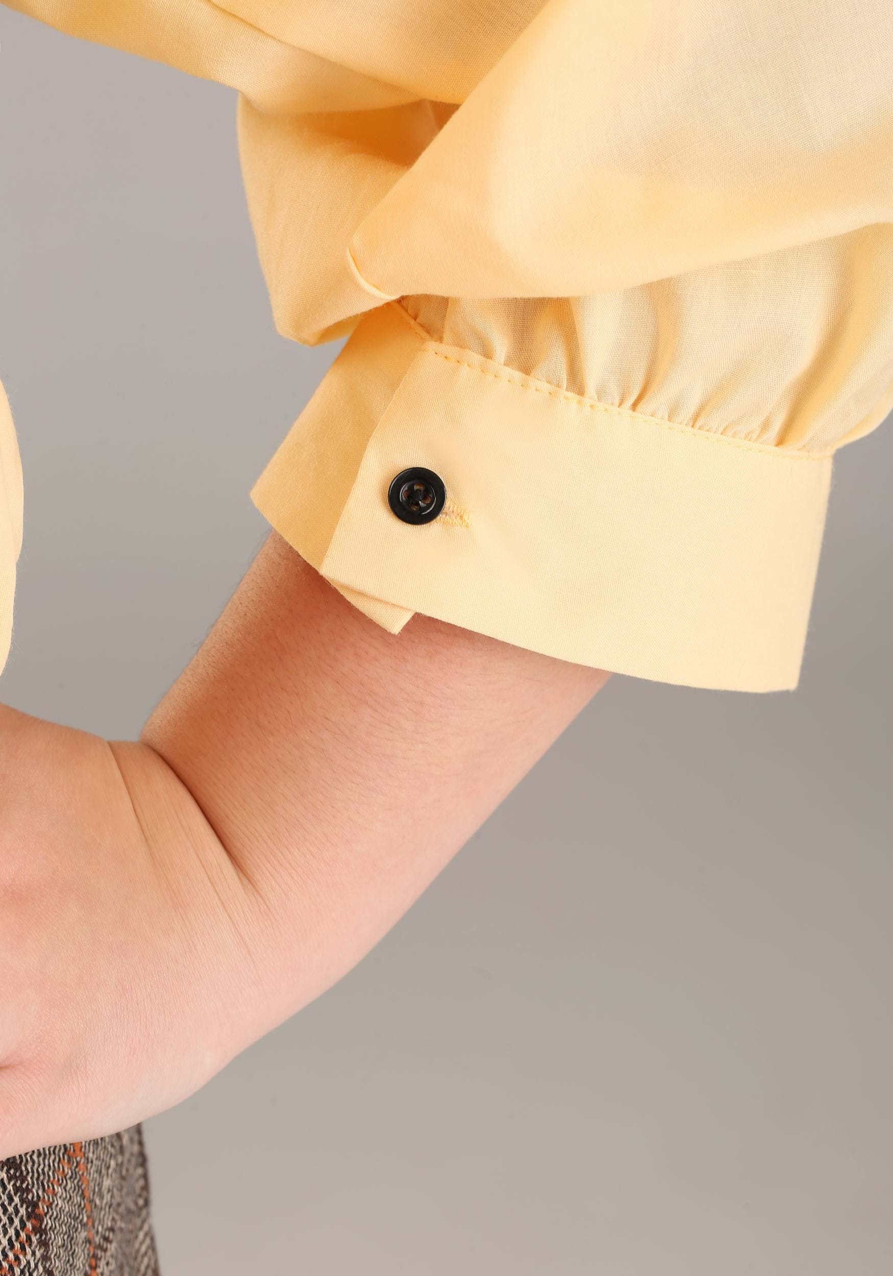- Broadcloth blouse has round neckline, cuffed sleeves