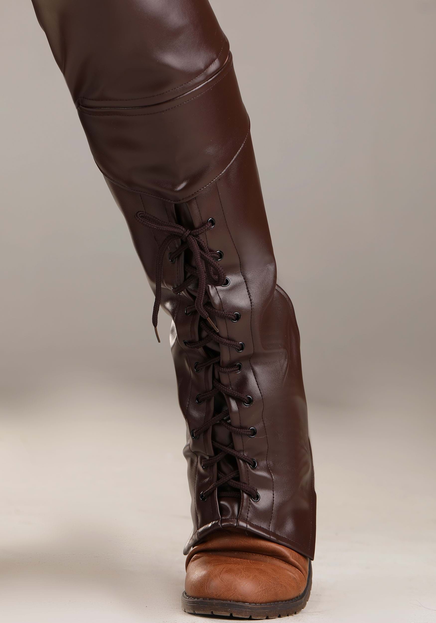 - Faux leather boot covers have elastic bands along back edge & under foot, decorative lacing at front